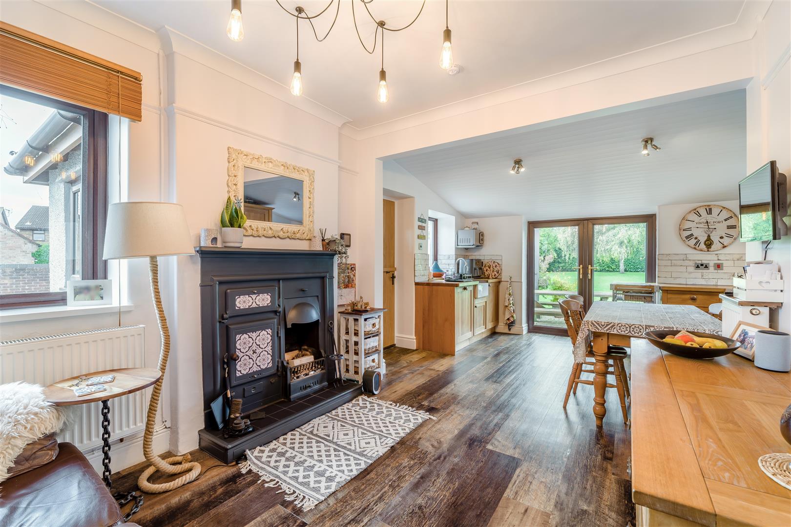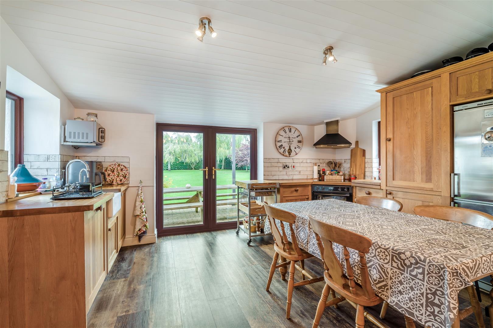 Kitchen/Dining Room - 6.30m x 4.37m (20'08 x 14'04) - An ideal space to entertain with bespoke handmade oak units having oak worktops and tiled splash-backs, inset Belfast sink unit, integral appliances include an electric oven with induction hob and extractor hood above, dishwasher and washing machine. Space for a fridge/freezer. Original open fireplace with bread oven and tiled hearth, radiators, Karndean flooring, dual aspect windows and rear aspect French doors opening onto the garden. A door leads off to the study, a doorway leads to the central hallway.