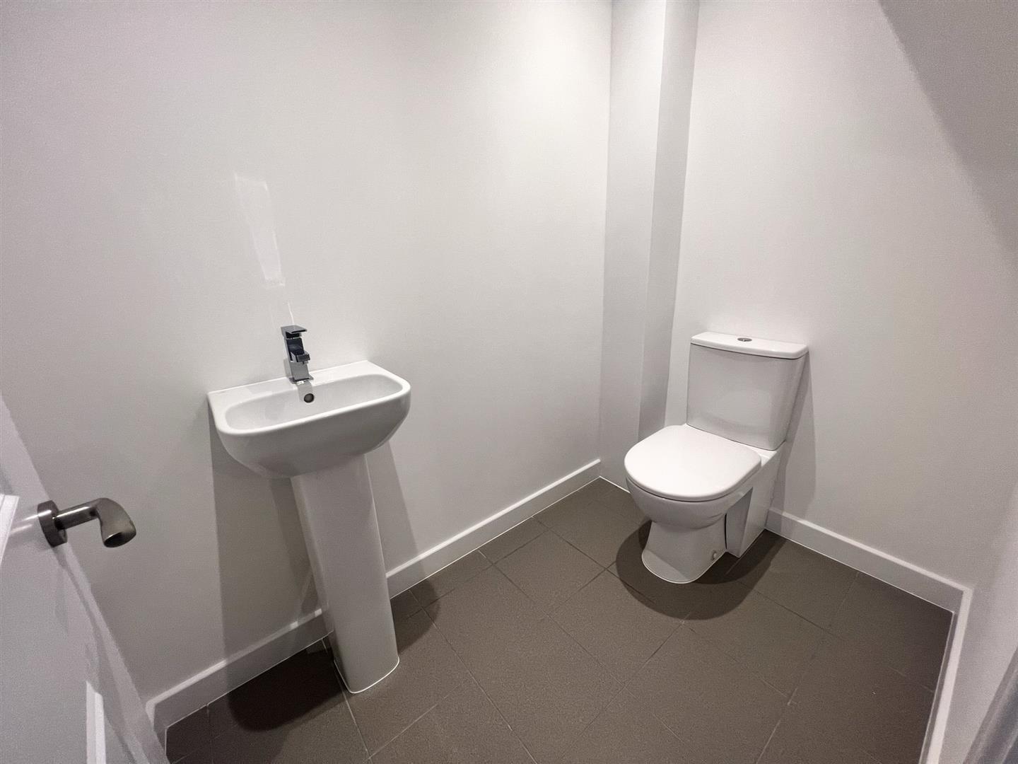 Cloakroom - White suite with close coupled w.c, pedestal wash hand basin with monobloc mixer tap over, LED downlighters , extractor fan, tiled flooring, single radiator.