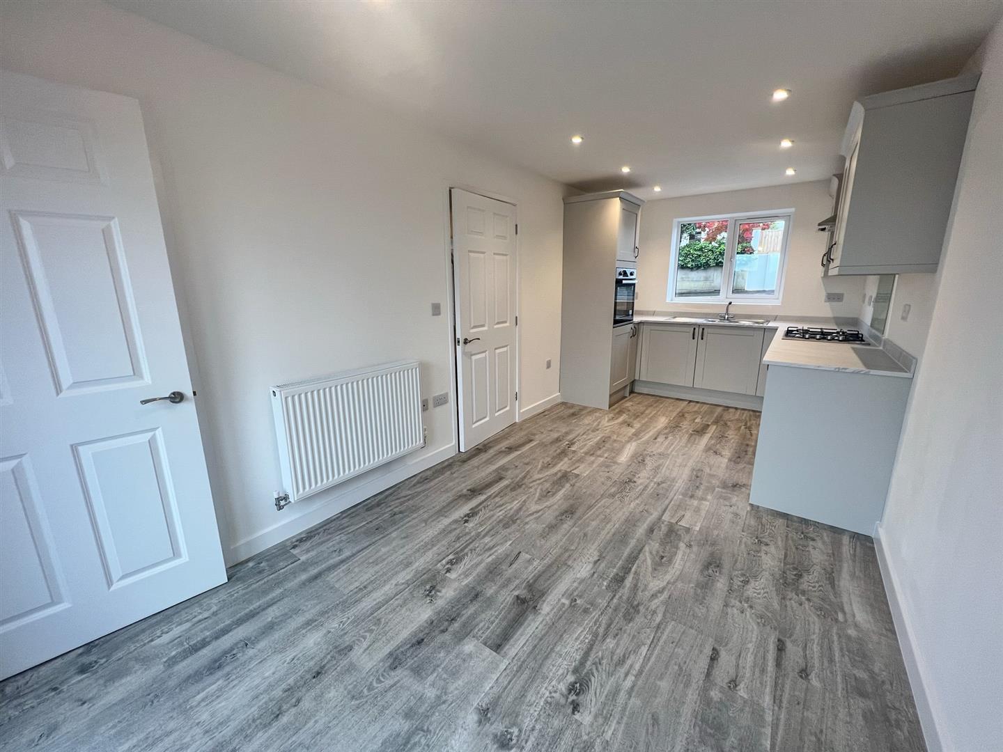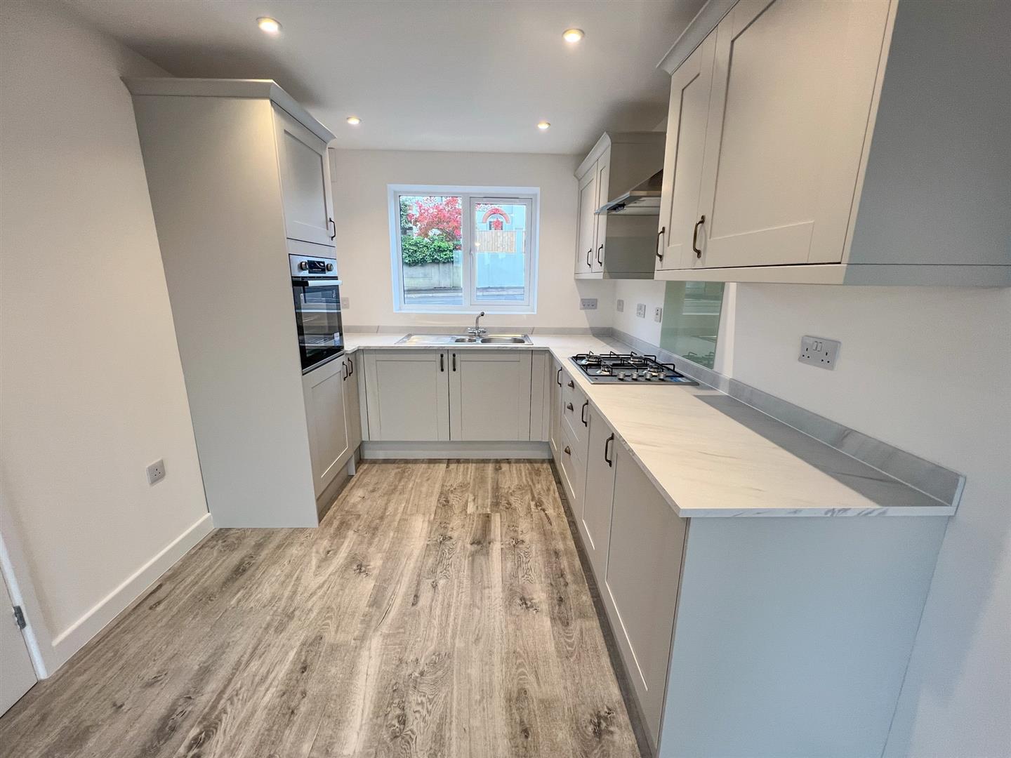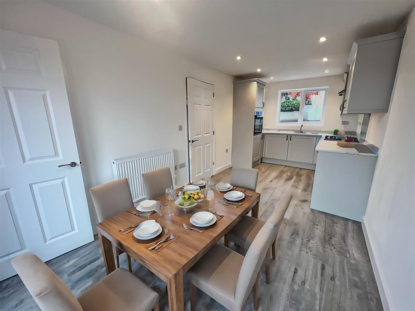 Kitchen/Dining Room - 5.84m x 2.57m (19'02 x 8'05) - Kitchen- One and a half bowl single drainer stainless steel sink unit with square edge worktops, marble effect laminate worktops and upstands, range of base and wall mounted units, power points, usb charging points, cooker point, glass splashback, four ring brushed stainless steel gas hob with extractor hood over, built-in electric oven, LED downlighters , continuation of the laminate flooring, extractor fan, front aspect upvc double glazed window overlooking the driveway.