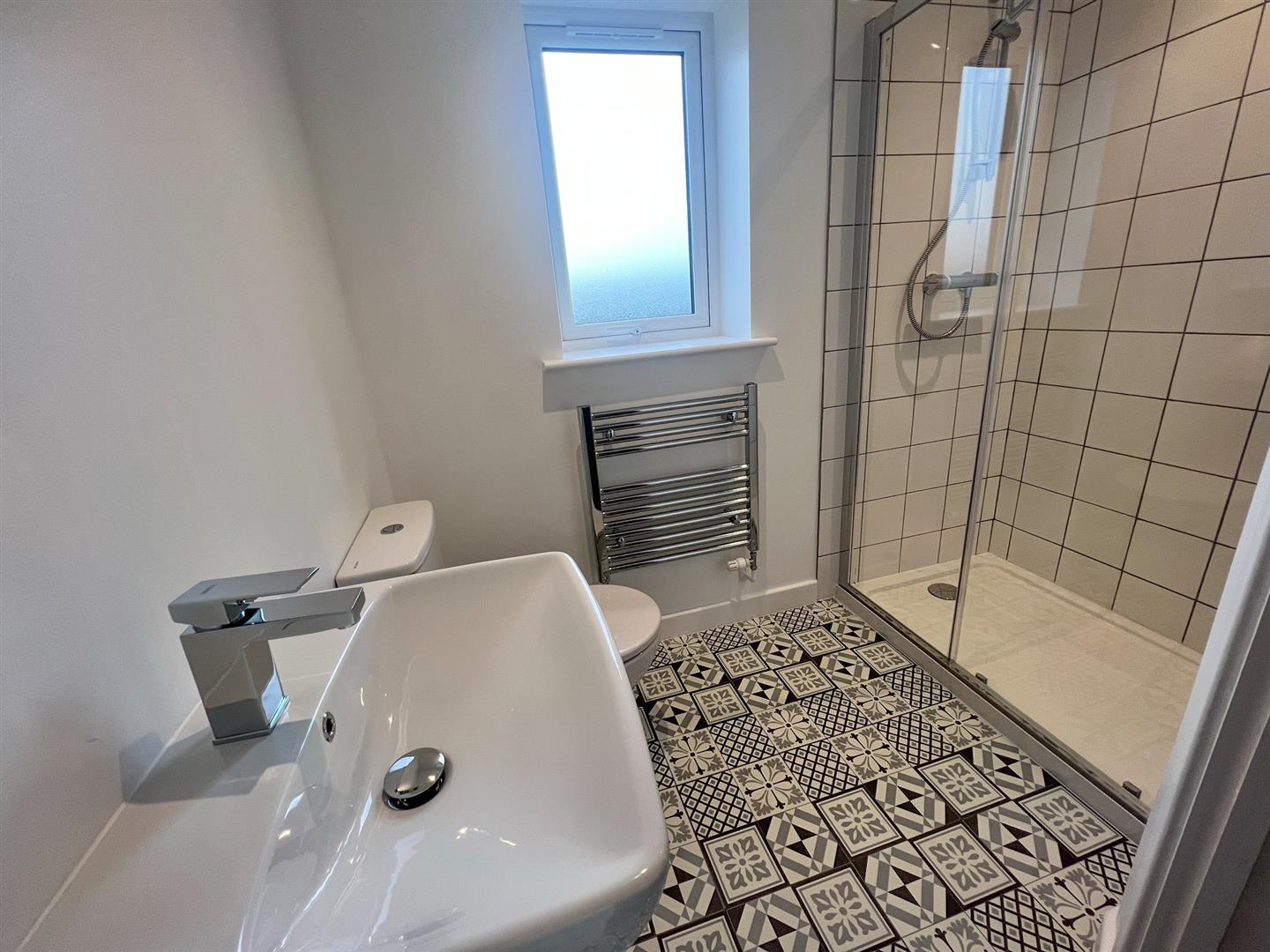 Ensuite Shower Room - Double shower cubicle with tiled enclosure, sliding door, mains Mira shower inset, white suite with close coupled w.c, pedestal wash hand basin with monobloc mixer tap over, shaver point, chrome heated towel radiator, tiled effect flooring, rear aspect upvc obscure double glazed window, inset ceiling spots, extractor fan.