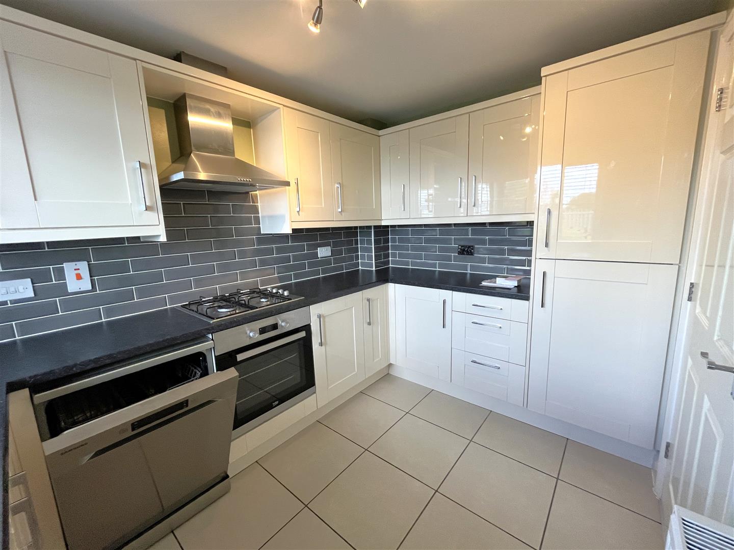 Kitchen - 3.28m x 2.31m (10'09 x 7'07) - Fully fitted high gloss wall and base level units with laminate worktops and tiled splash-backs, inset 1.5 bowl stainless steel sink unit with drainer. Integral appliances include an electric oven with gas hob and extractor hood over, fridge/freezer. Space and plumbing for a washing machine and dishwasher. Tiled floor, radiator, front aspect window.