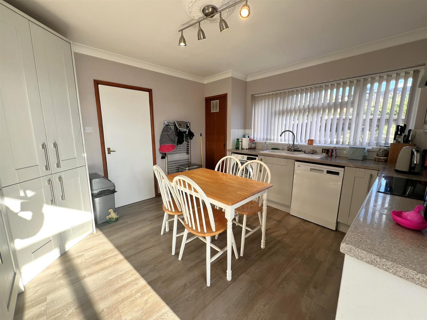 Kitchen/Breakfast Room - 3.58m x 4.04m (11'09 x 13'03) - One and a half bowl single drainer sink unit with mixer taps over, rolled edge worktops, range of base and wall mounted units, tiled surrounds, power points, four-ring induction hob with extractor hood over, Neff double oven, large pantry cupboard, dishwasher, automatic washing machine, door giving access to a small cupboard housing the gas fired central heating and domestic hot water boiler, ceiling rose, ceiling light, coving, continuation of the wood effect flooring, rear aspect upvc double glazed window overlooking the garden, door giving access into: