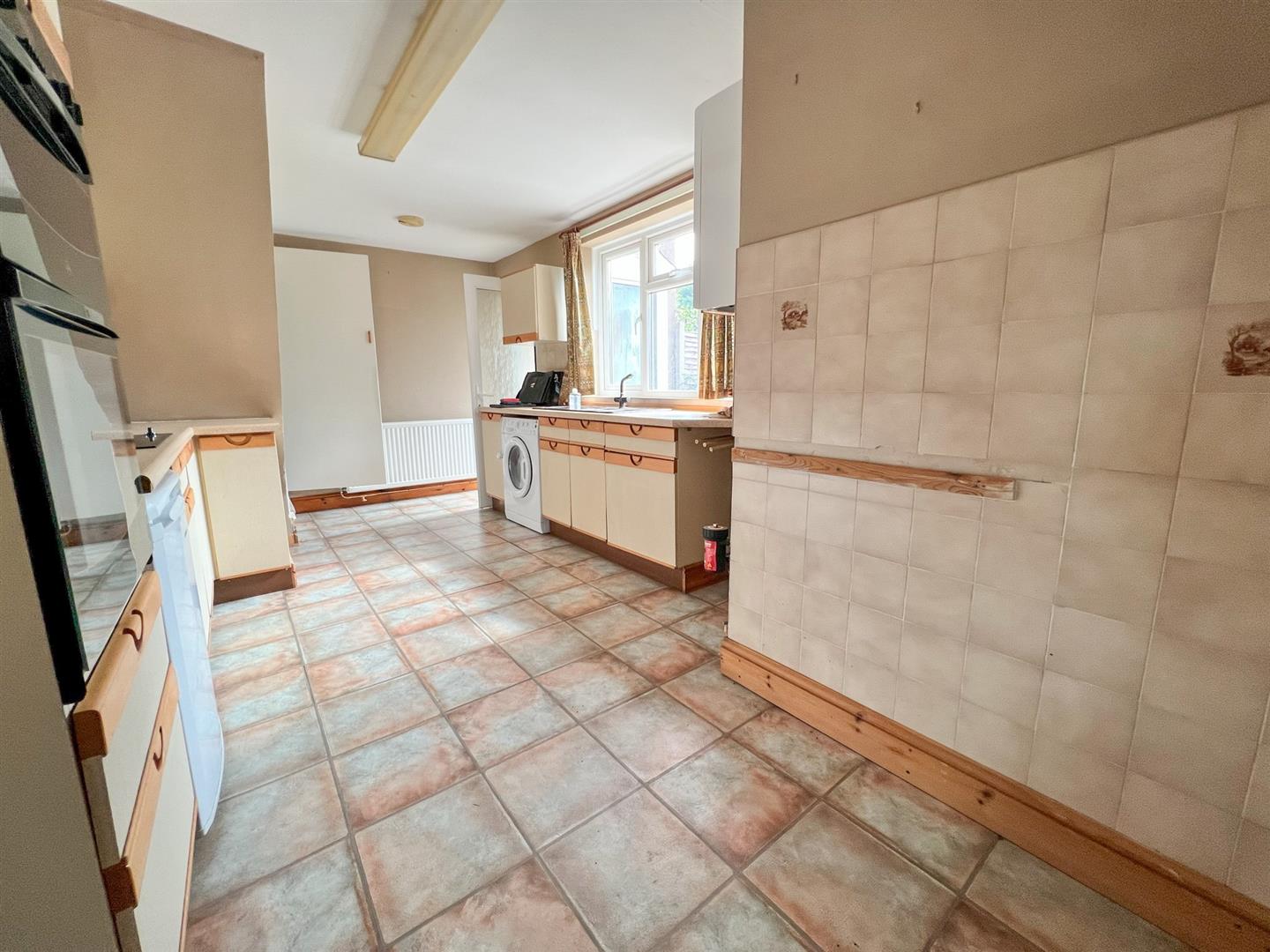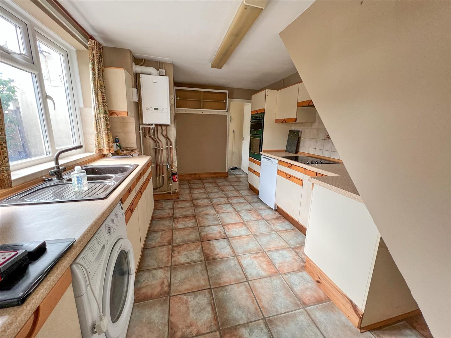 Kitchen/Breakfast Room - 5.36m x 3.00m (17'07 x 9'10) - One and a half bowl single drainer sink unit with mixer tap over, rolled edge worktops, range of base and wall mounted units, tiled surrounds, built-in four ring electric hob with electric double oven and filter hood above, power points, laminate flooring, plumbing for automatic washing machine, radiator, ceiling light, wall mounted gas fired central heating and domestic hot water boiler, rear aspect upvc double glazed window overlooking the rear garden. door giving access into: