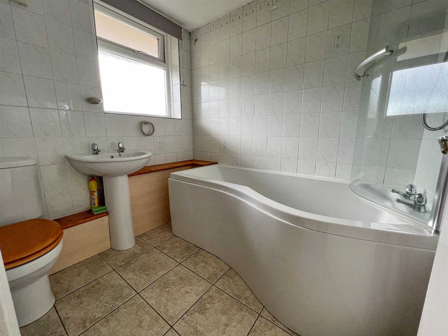 Bathroom - White suite with close coupled w.c, pedestal wash hand basin, P shaped bath with electric shower fitted over, curved shower screen, tiled surround, tiled flooring, ceiling light, extractor fan, radiator, door to airing cupboard with radiator and slatted shelving space, upvc obscure double glazed window.