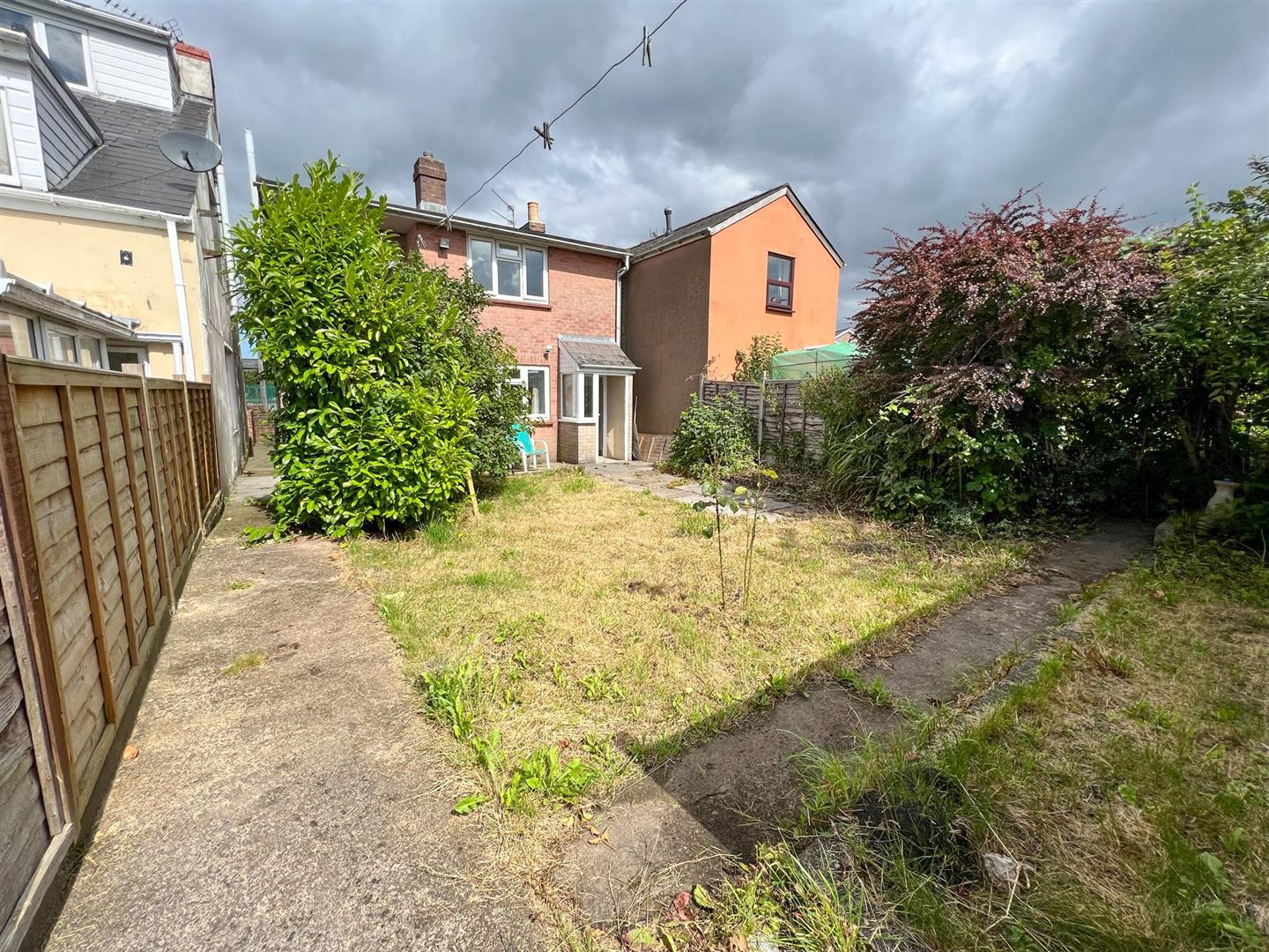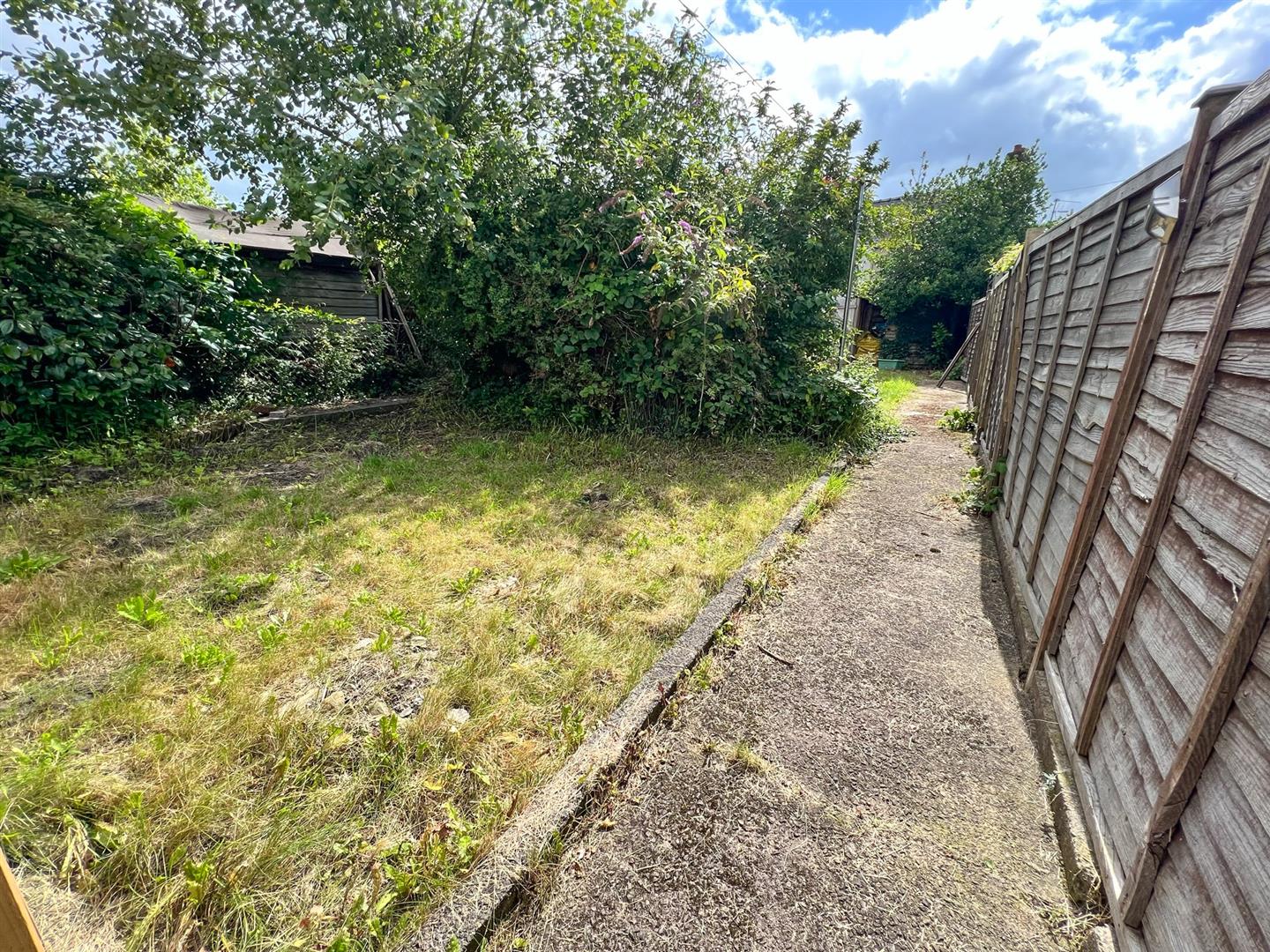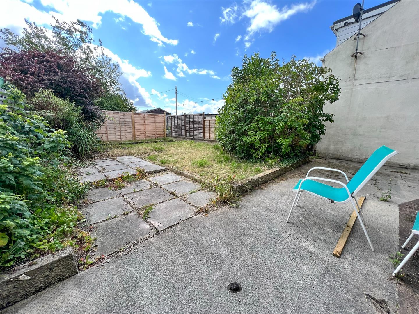 Gated access and a pathway lead around to the right-hand side, guiding you to the rear garden. Here, you'll find convenient amenities such as an outside tap and outdoor lighting. The garden features a patio area and a lawned space. The garden is enclosed by fencing, providing privacy.