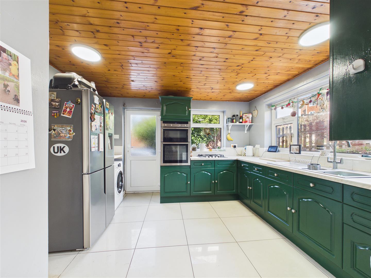 Kitchen - Comprises one and a half bowl single drainer stainless steel sink with mixer tap over, rolled edge worktops, range of base and wall mounted units, tiled surrounds, timber tongue and groove clad ceiling with LED lighting, built-in Neff double oven, four ring gas hob, space for washing machine, space for larder style freezer, tiled flooring, double radiator, power points, rear aspect window overlooking the garden, side aspect window and door to the driveway. Opening to understairs storage are with lighting.