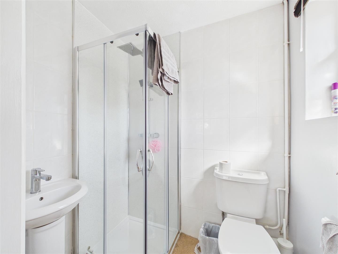 En-Suite - Close coupled W.C, pedestal wash hand basin with monobloc mixer tap over, shower cubicle with mains fed shower with conventional and drencher head, ceiling light, part tiled walls, single radiator with side aspect obscure window.