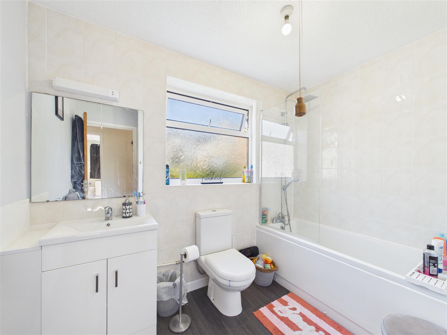Family Bathroom - Comprising ceiling light, white suite with close coupled W.C, vanity wash hand basin with monobloc mixer tap over, cupboard beneath, white side panel bath with mixer tap fitting, radiator, wood laminate effect flooring, obscure window, shaver light and point.