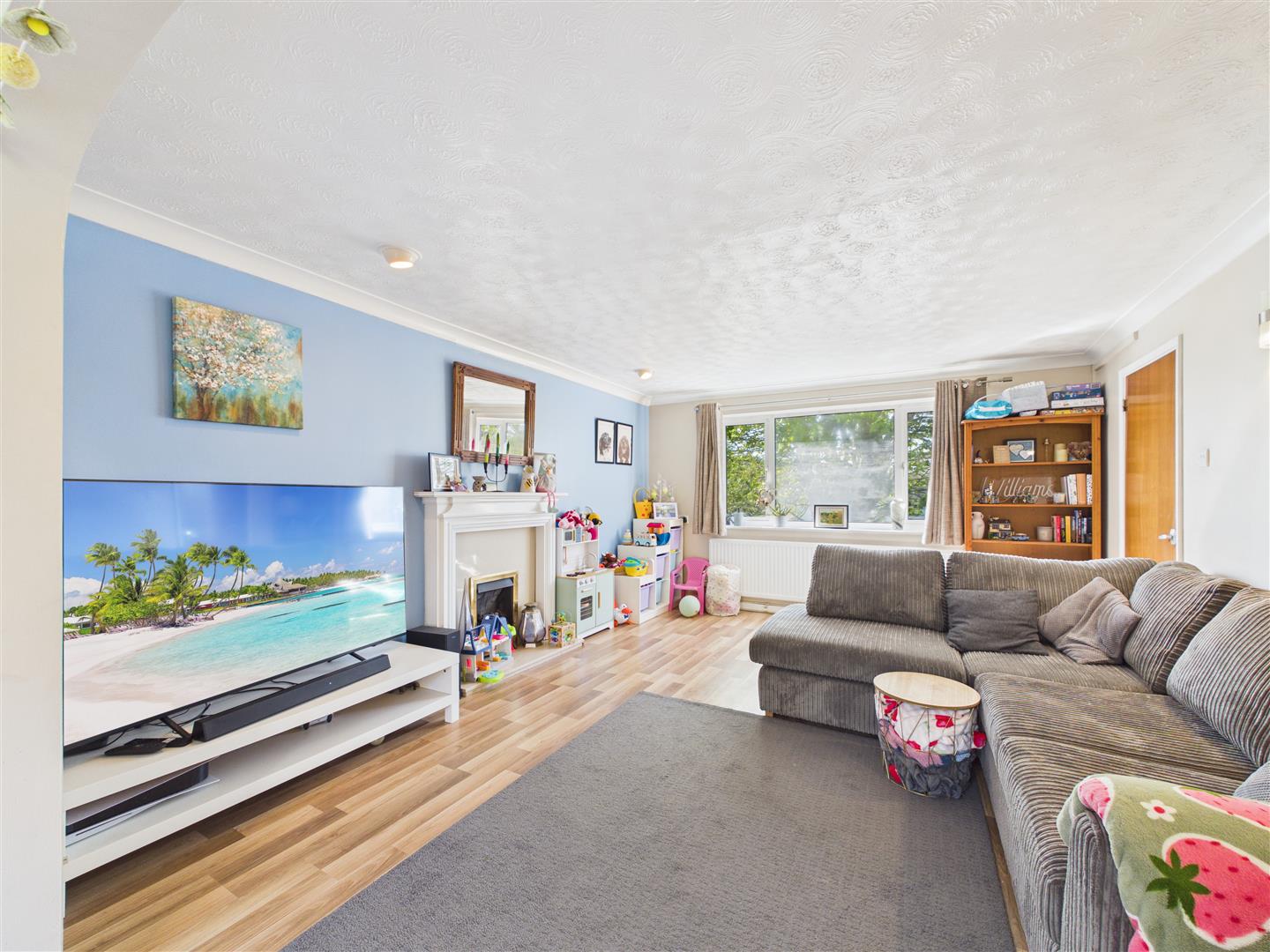 Living Room - Ceiling lights, coving, wall lights, large radiator, feature fireplace with gas living flame fire inset, power points, wood laminate flooring, front aspect window overlooking the garden and driveway.