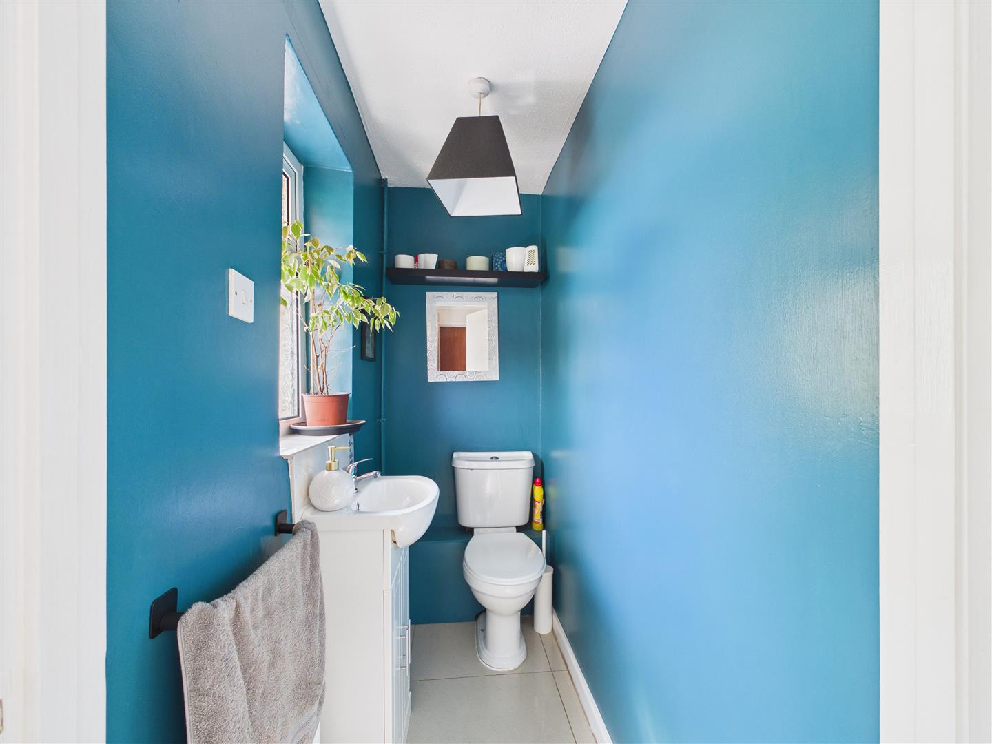 Cloakroom - Comprises close coupled WC, vanity wash basin with monobloc tap and cupboard beneath, ceiling light, tiled floor, single radiator, window to front aspect.