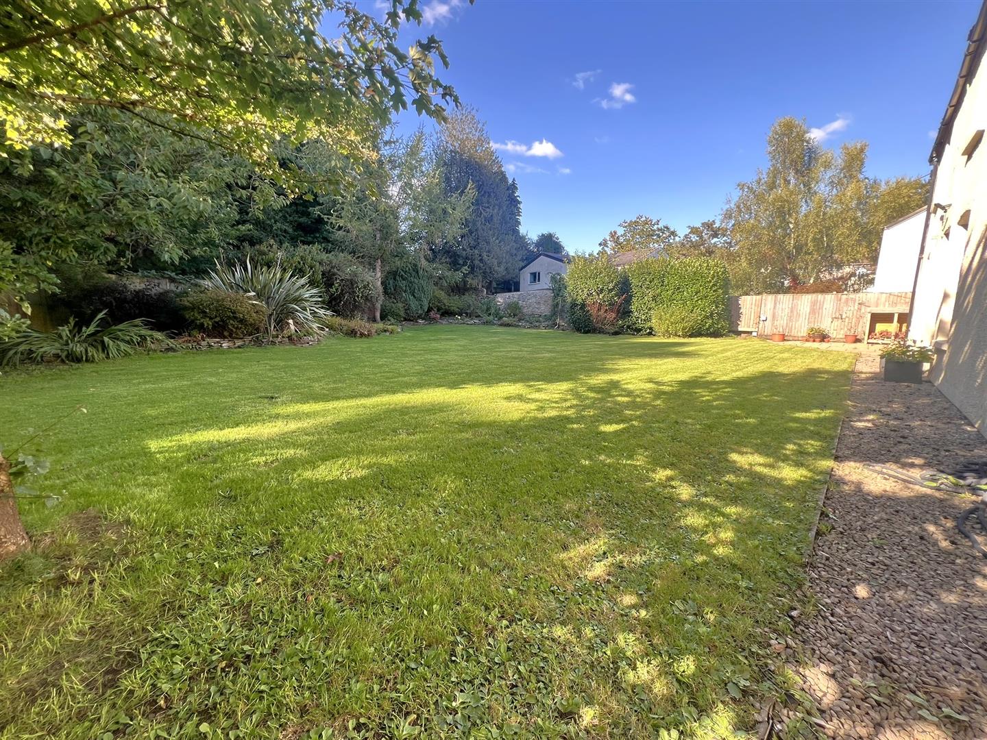Gated access opens into the generous rear garden, which is mainly laid to lawn with well-stocked flower borders, mature shrubs, and a feature tree. The garden backs directly onto forest and woodland, creating a private outlook. Further benefits include outside lighting, an outside tap, a patio seating area, and outside power points.