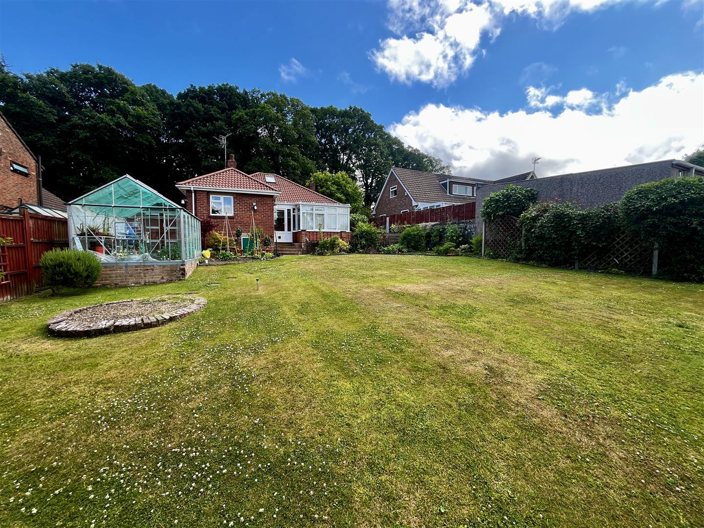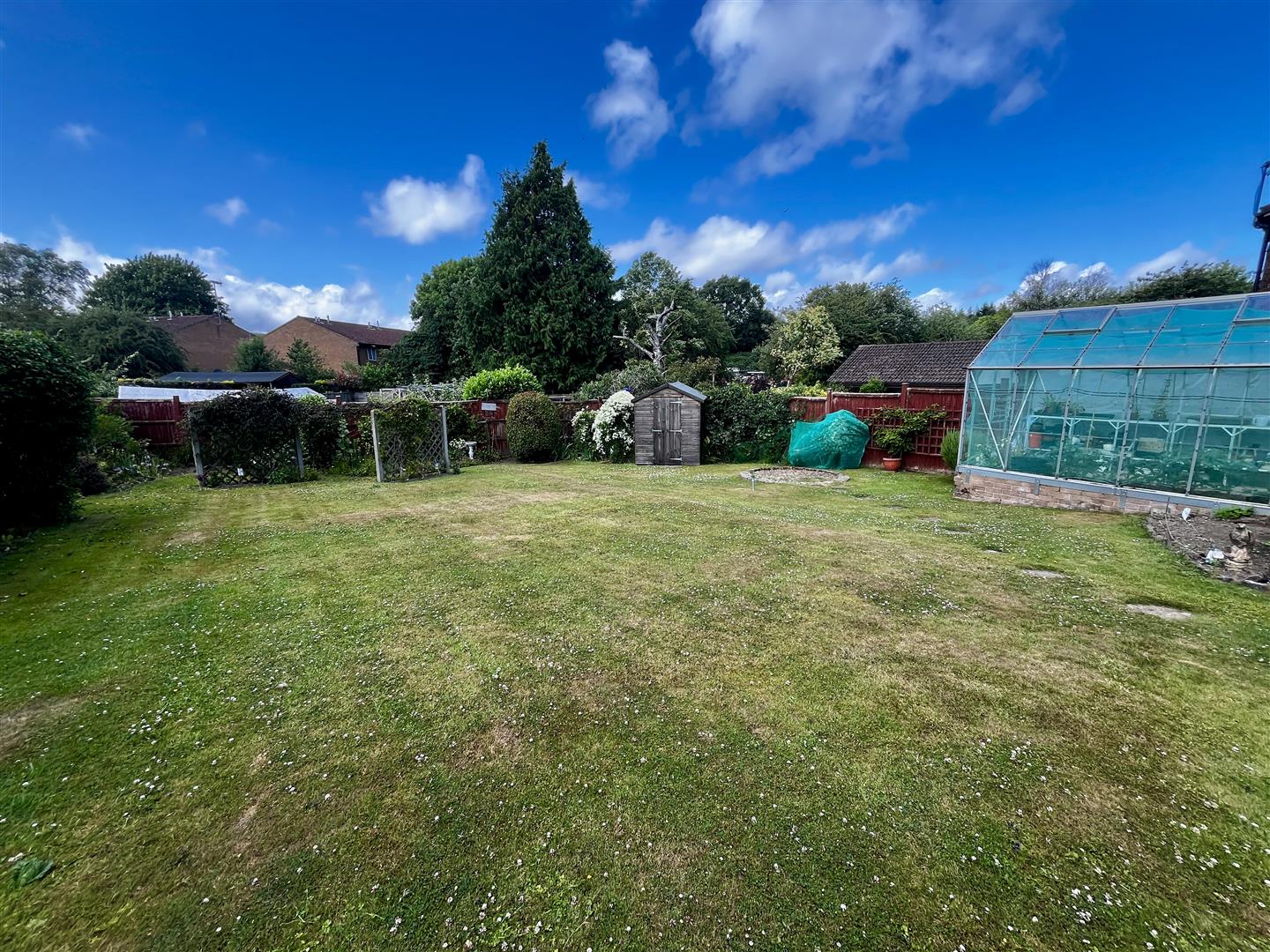 The rear garden is an attractive, well-maintained space, primarily laid to lawn and bordered by mature flower beds. It features a large greenhouse, a garden shed, and a patio seating area, all enclosed by fencing for privacy.