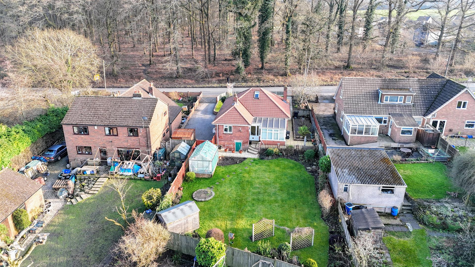 Outside - At the front of the property, gated access opens onto a spacious driveway with off-road parking for multiple vehicles. The front garden is mostly laid to lawn, with a pathway leading to the front door and a lovely view of the surrounding woodland. A side gate provides access to the rear garden.