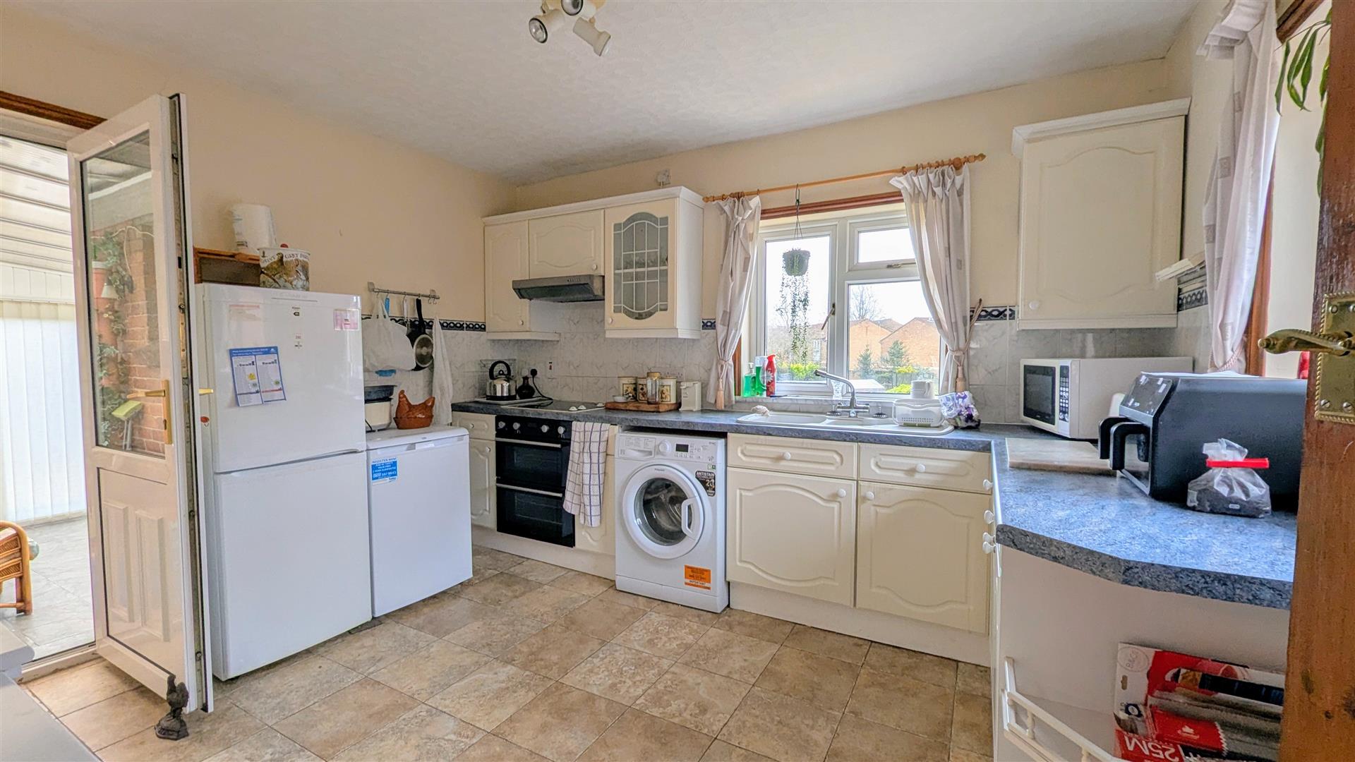 Kitchen - 3.63m x 3.05m (11'11 x 10'00) - Tiled flooring, a range of wall, drawer and base mounted units, rolled edge worktops, double oven with four ring electric hob above, space and plumbing for a washing machine, space for fridge/freezer, one and a half bowl single drainer sink unit with mixer tap above, radiator, partly tiled walls, front and side aspect upvc double glazed windows, Door through into: