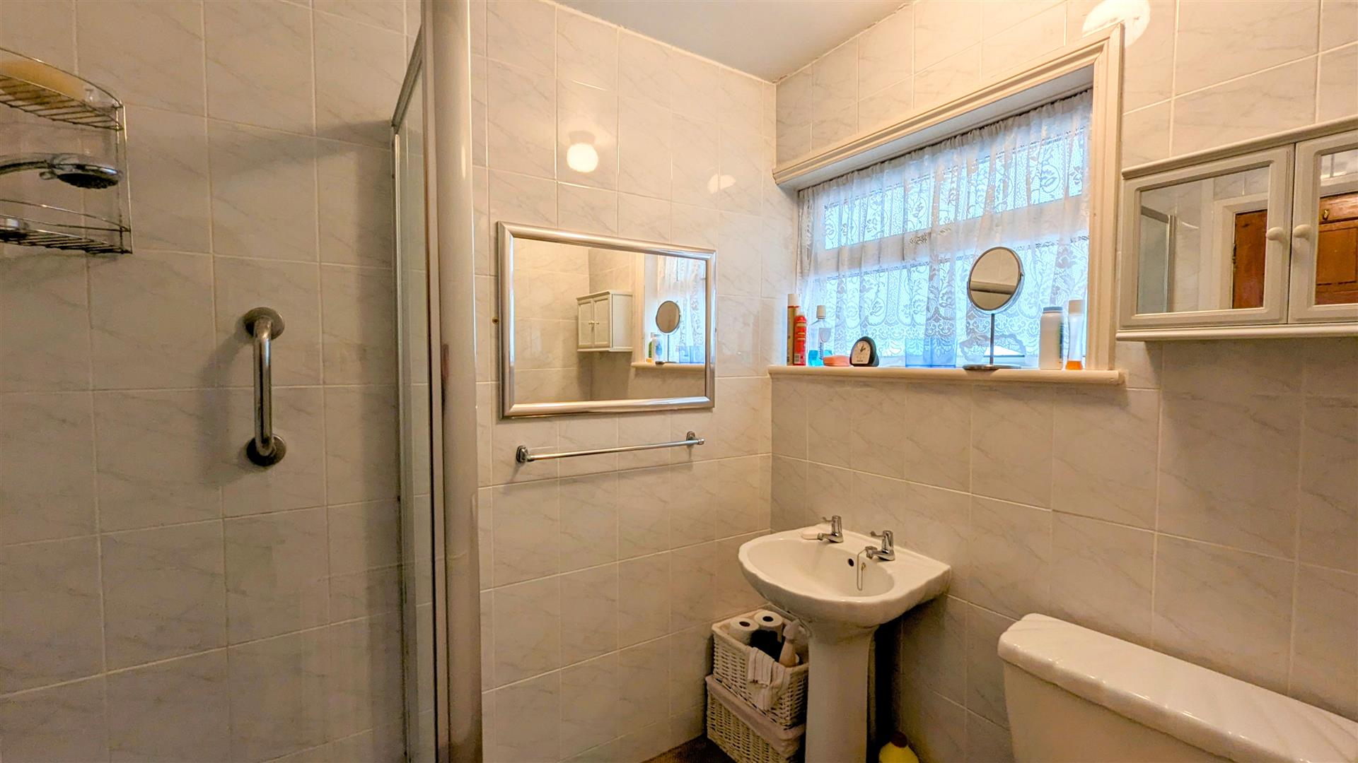 Shower Room - 1.75m x 2.03m (5'09 x 6'08) - Corner shower with mains shower attachment and tiled surrounds, pedestal wash hand basin, W.C, radiator, tiled walls, rear aspect upvc double glazed frosted window.
