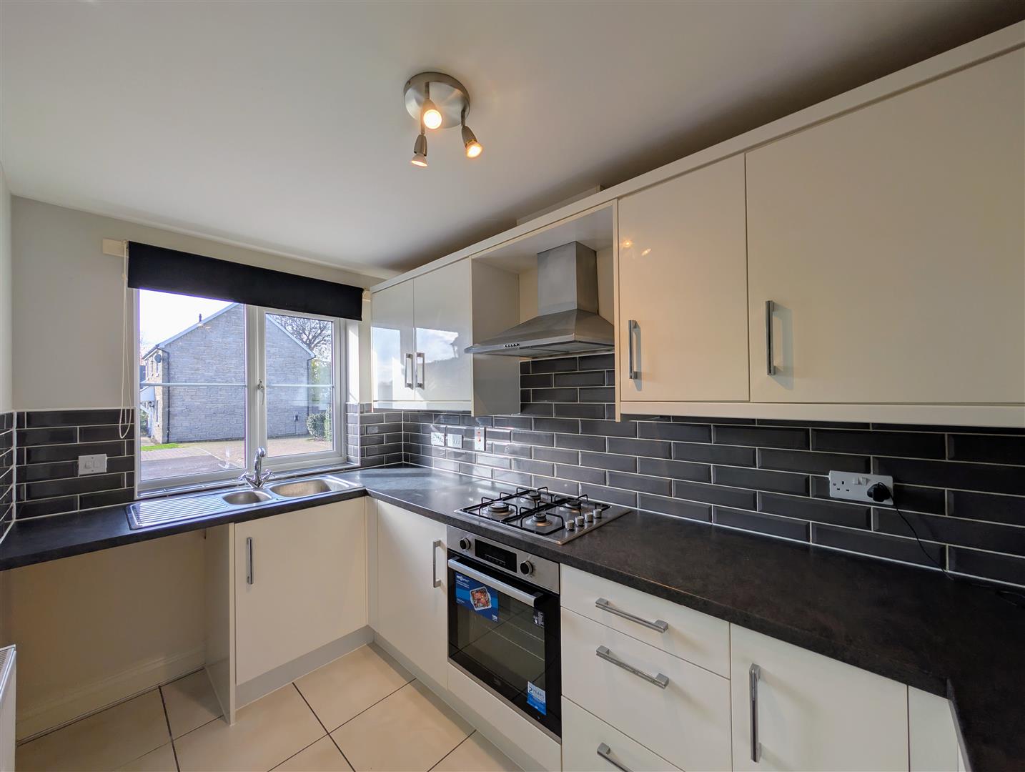 Kitchen - 3.35m x 1.85m (11'00 x 6'01) - A modern fitted kitchen with a range of base, wall, and drawer-mounted units beneath rolled-edge worktops. Includes a one-and-a-half bowl stainless steel sink with mixer tap, integrated oven with four-ring gas hob and extractor hood above, space and plumbing for a washing machine, and space for a fridge-freezer. Finished with part-tiled walls, ample appliance and power points, and a front aspect UPVC double-glazed window.