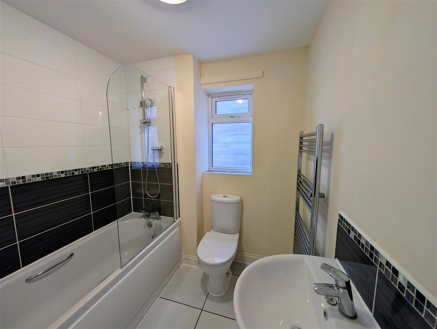 Bathroom - 1.96m x 1.93m (6'05 x 6'04) - A white suite comprising panel bath with shower over and tiled surround, low-level WC, pedestal wash hand basin with tiled splashback, heated towel rail, tiled flooring, and side aspect frosted UPVC double-glazed window.