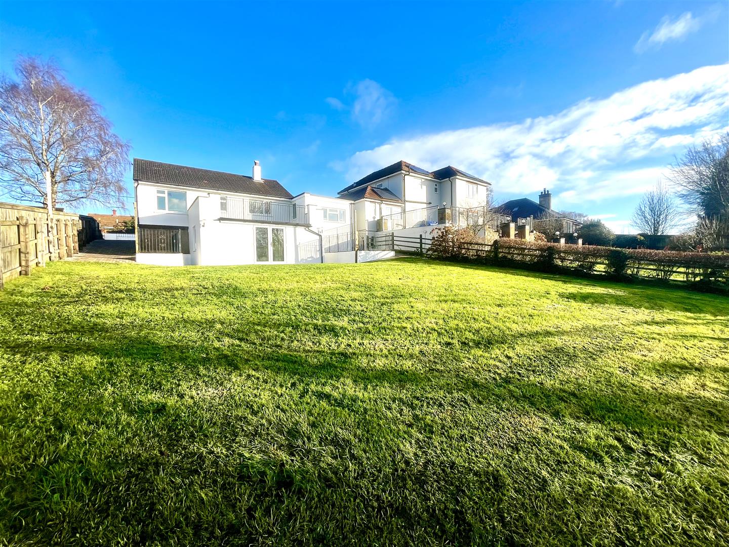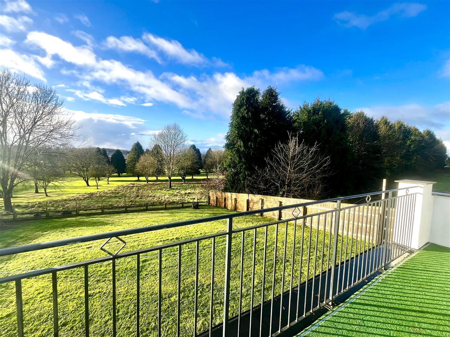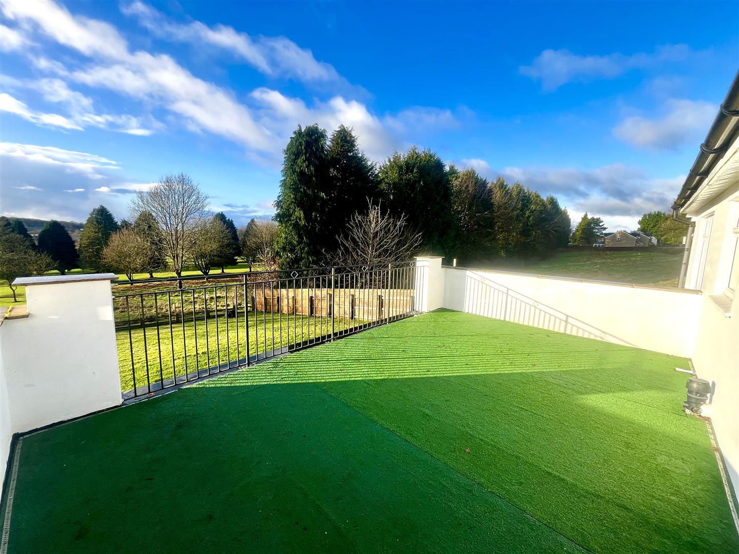 Rear Garden - Large laid to lawn area with stunning rear aspect views over the golf course, raised patio area, fully gated and surrounded by fencing and hedging.