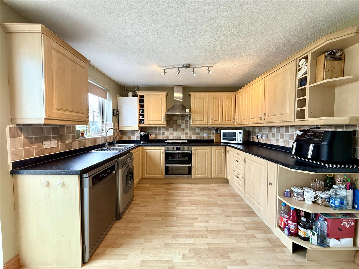 Kitchen - 3.10m x 4.37m (10'02 x 14'04) - Rear aspect double glazed upvc window, range of wall, drawer and base mounted units, space for dishwasher, space for washing machine, built in oven with four ring gas hob and extractor fan, combi boiler, space for large American style fridge/ freezer, radiator, power points, sliding doors giving access into: