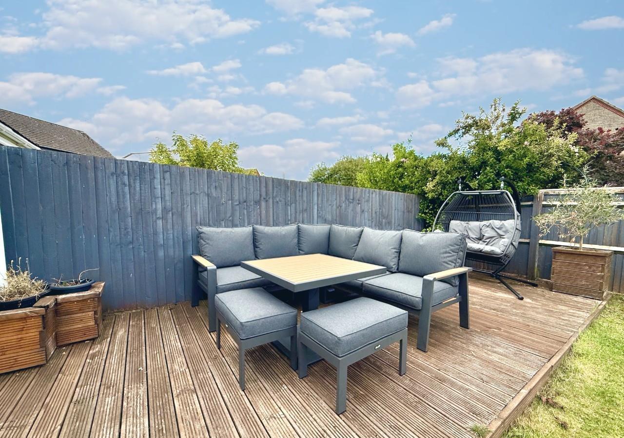 Rear Garden - Patio area, laid to lawn area, raised decking area which is a perfect seating entertaining spot, all surrounded by fencing.