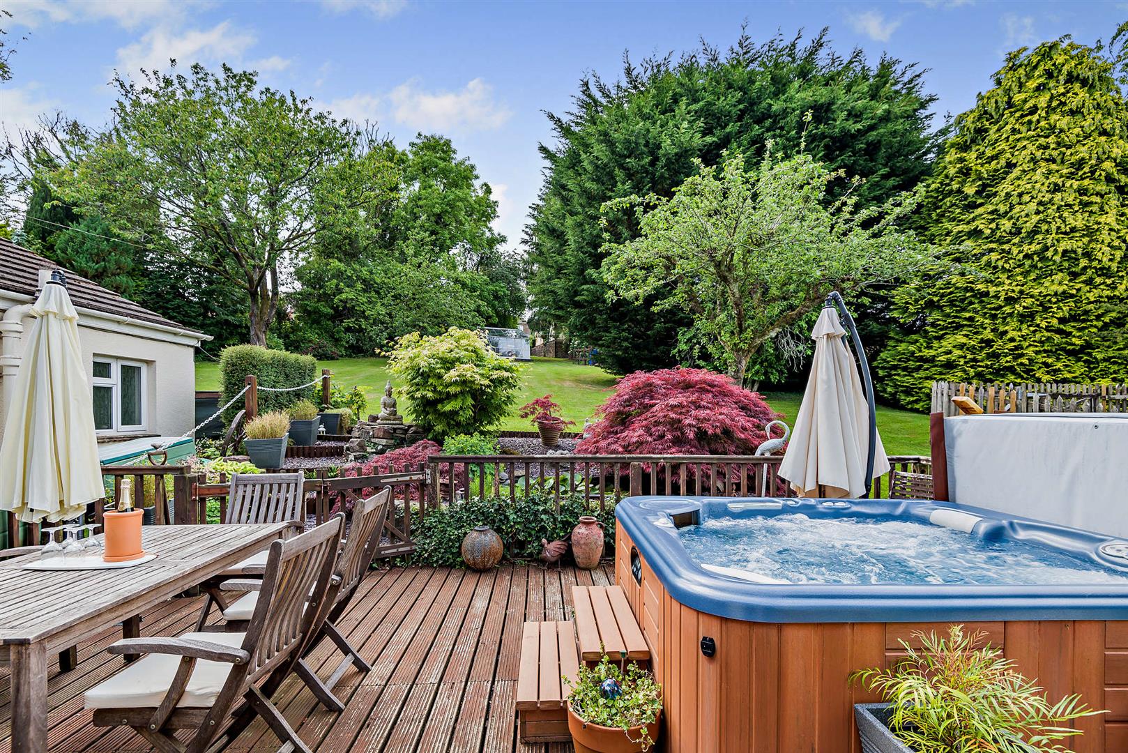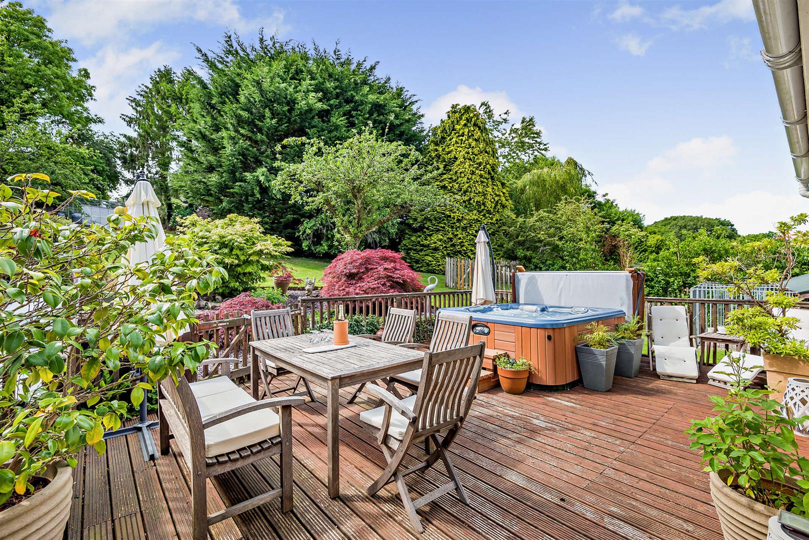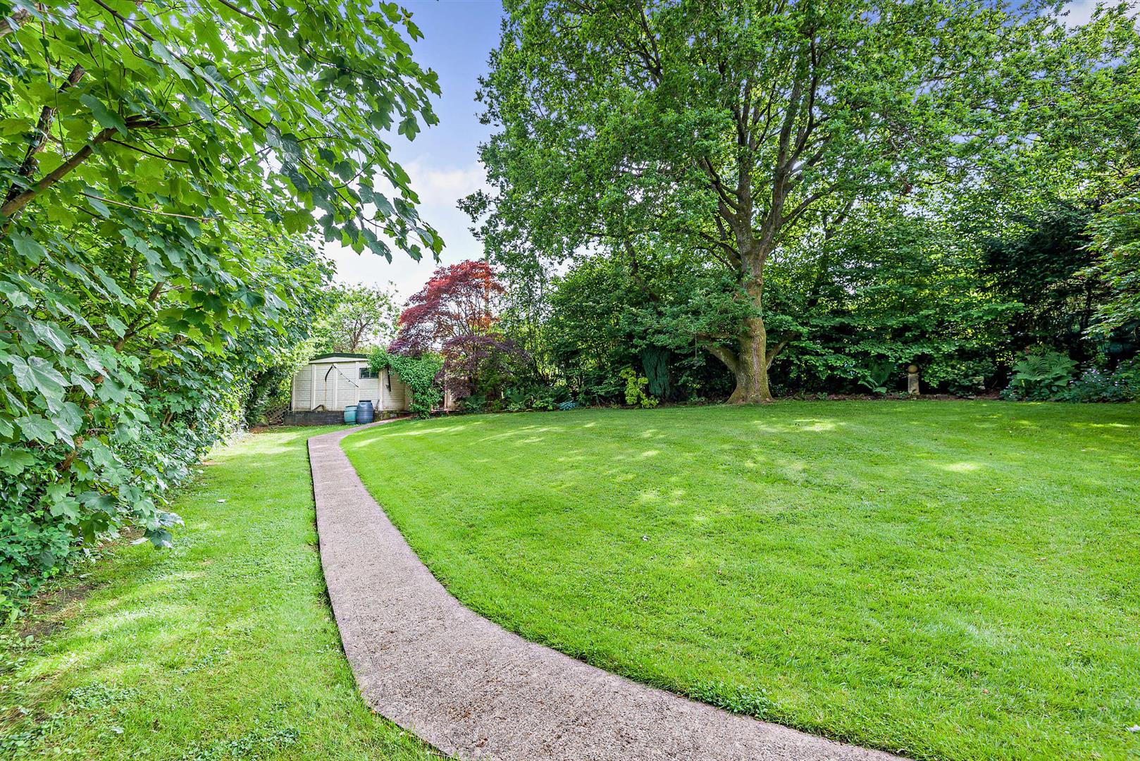The rear garden is predominantly laid to lawn, interspersed with a variety of mature trees, including a winter garden and fruit trees such as forest plums, apples, and black cherries. Notably, none of the trees are subject to preservation orders, allowing the new owners to retain the garden's privacy or to modify it as desired.