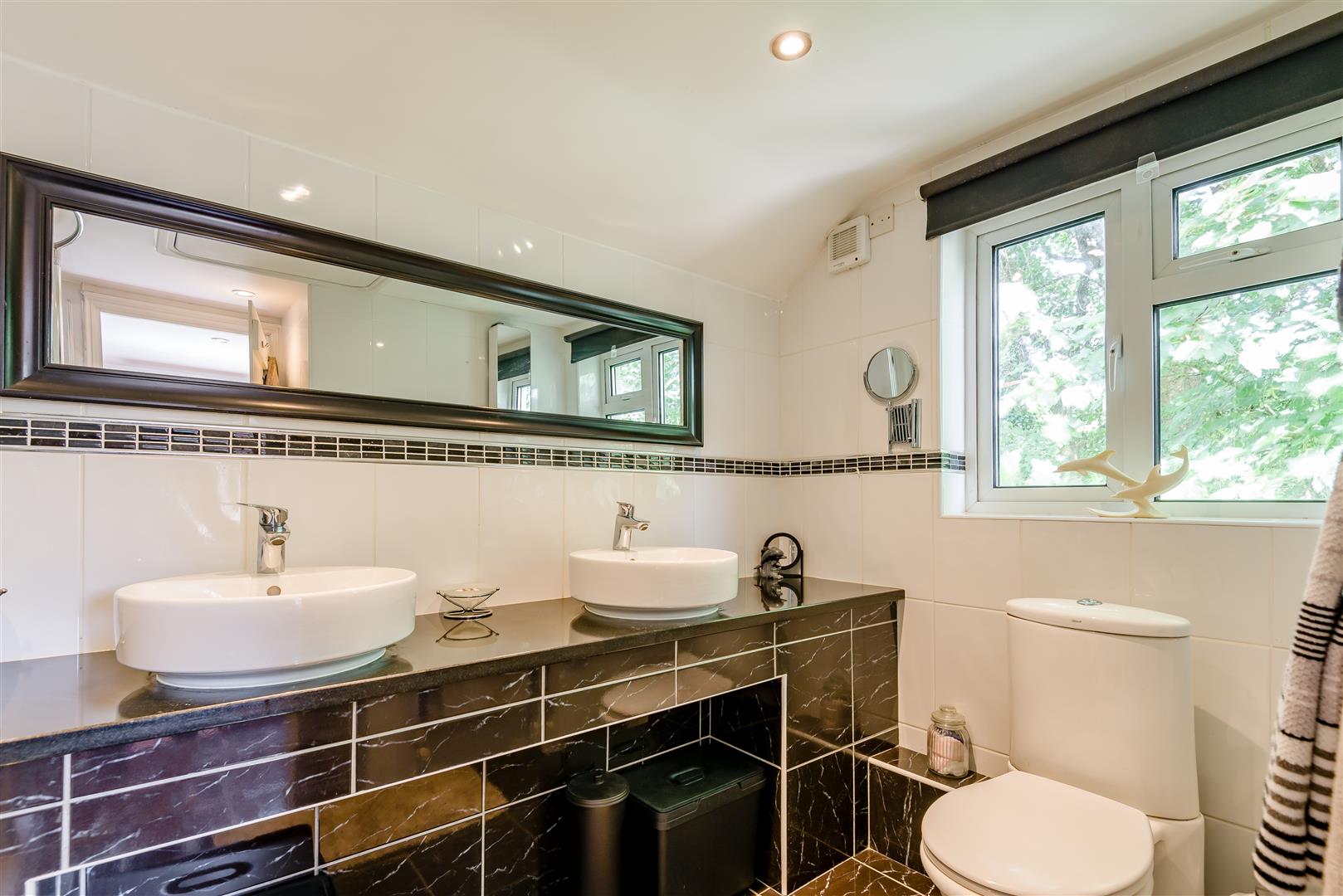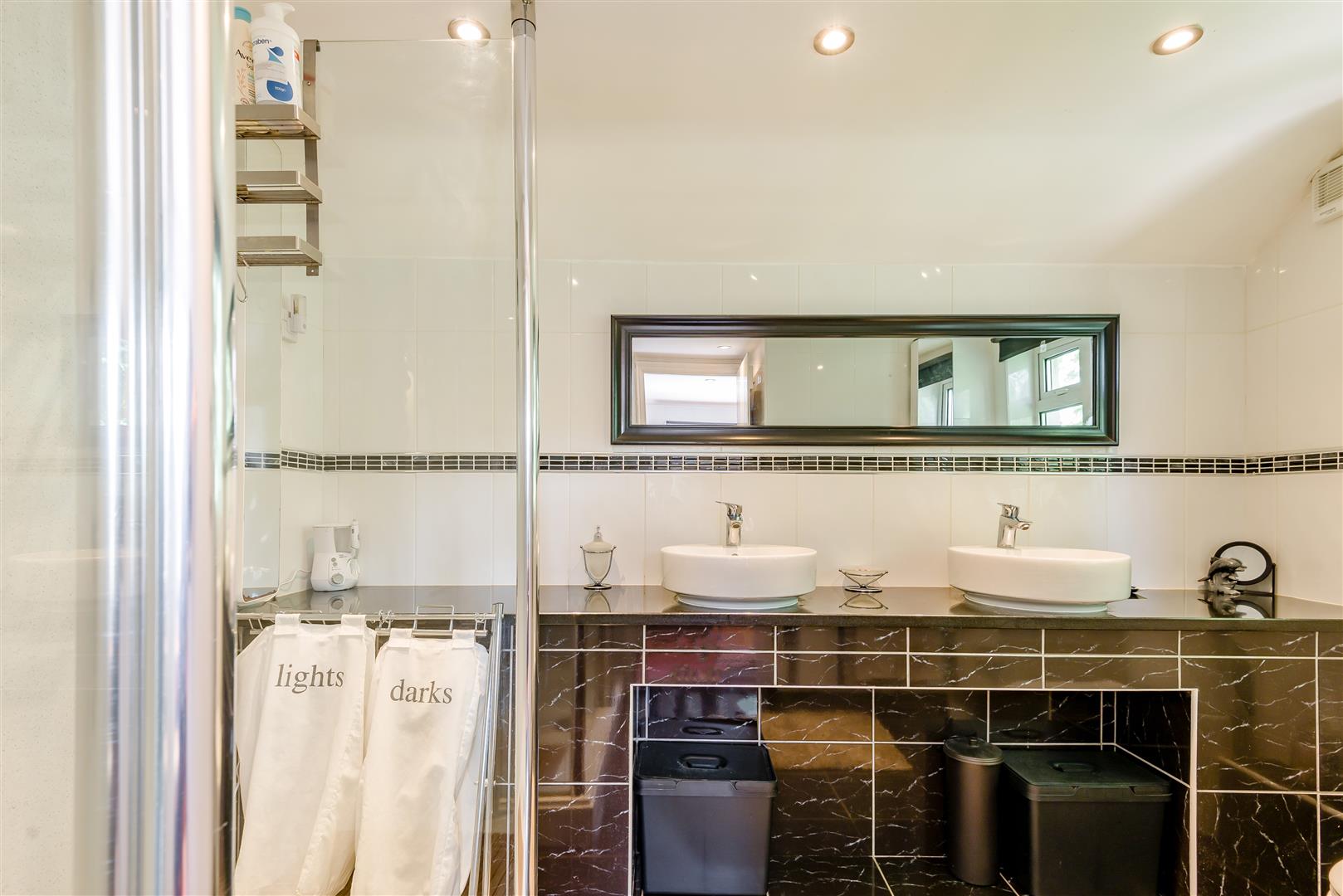 En-Suite - 3.00m x 2.41m (9'10 x 7'11) - Shower enclosure with mains shower over, low level WC, two sinks, heated towel rail, tiled walls, tiled flooring, inset ceiling spotlights, access to loft space, side aspect double glazed upvc window.