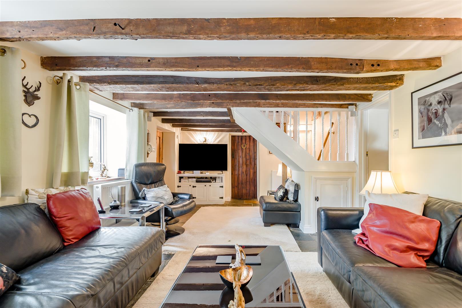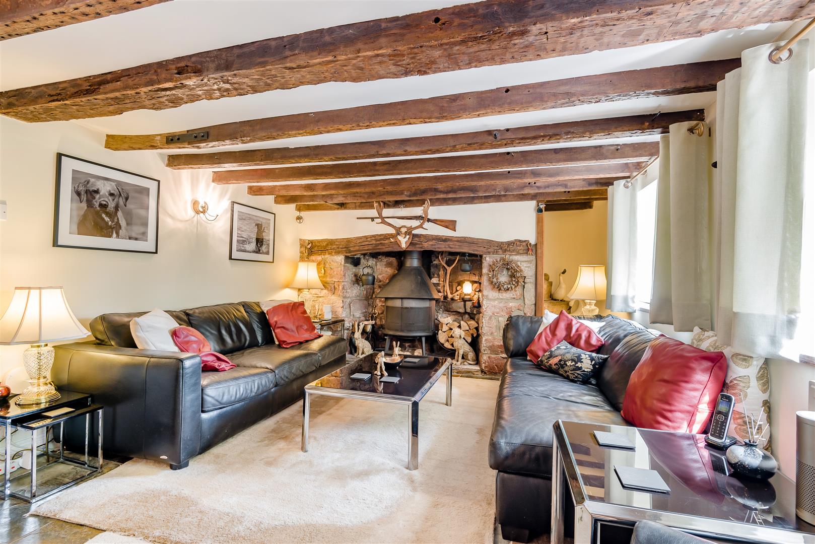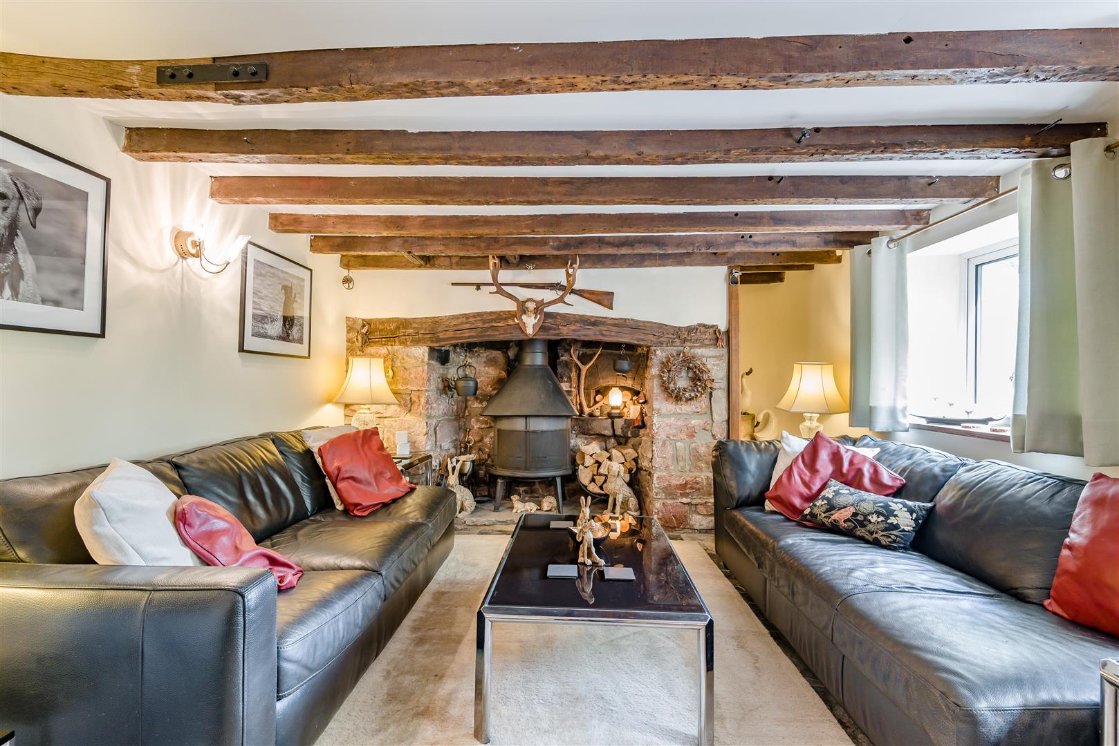 Lounge - 6.12m x 3.43m (20'01 x 11'03) - Inglenook fireplace made with stone from Clearwell Quarry with feature bread oven, solid wooden mantel and inset Jotul 6 multi fuel burner burner which can also be used as an open fire, stone tiled flooring, old original staircase creating a lovely feature to the room, understairs storage cupboard, power points, two radiators, television point, stairs to the first floor landing, front aspect double glazed upvc windows, thumb latch door to: