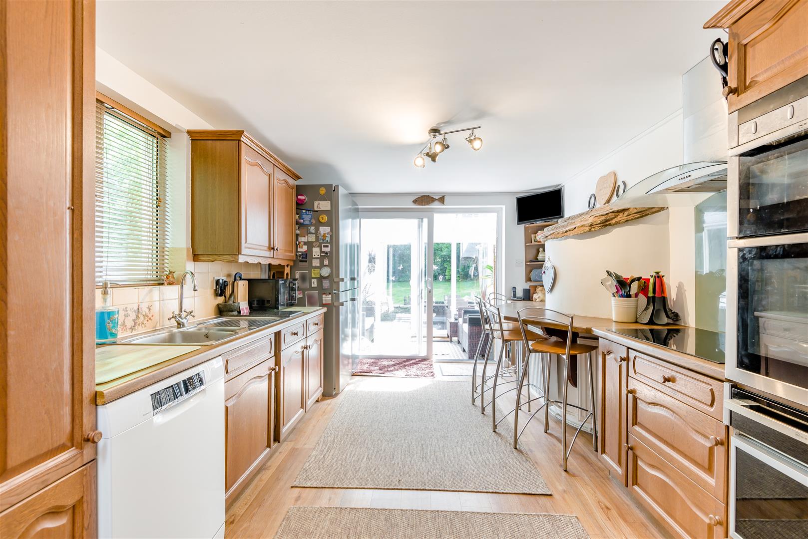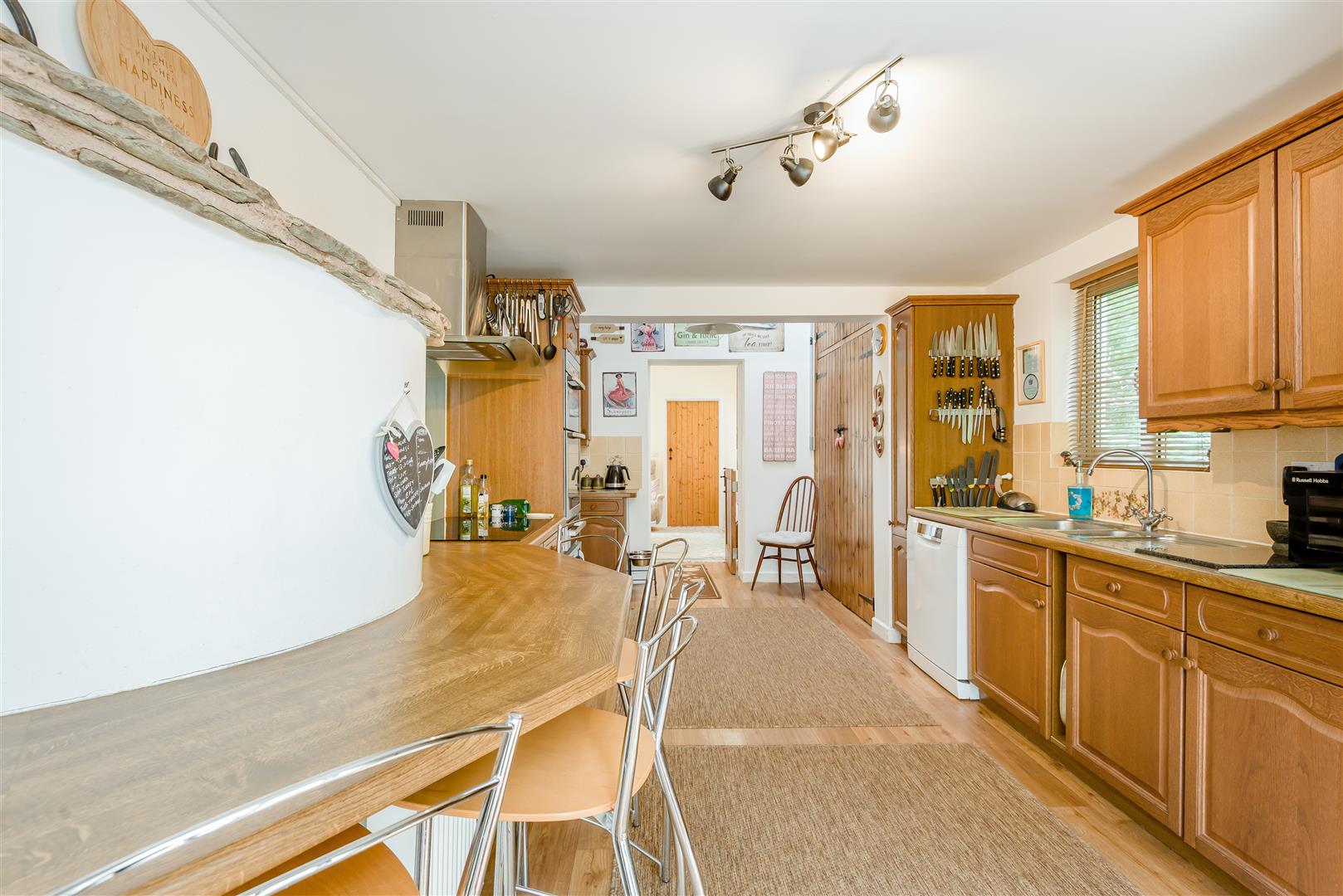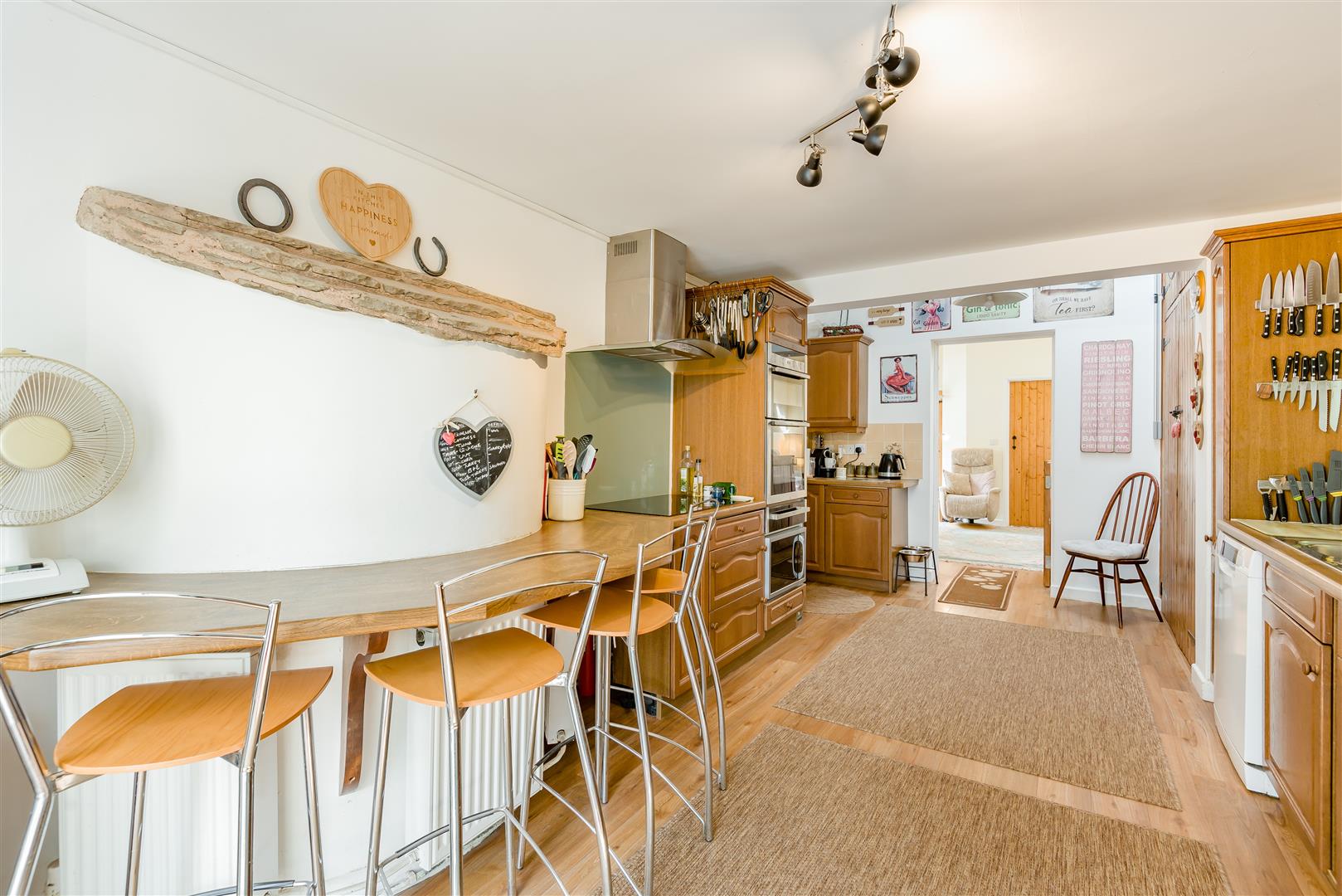 Kitchen - 5.84m x 2.49m (19'02 x 8'02) - A range of base, drawer and wall mounted units, rolled edge worktops, one and a half bowl single drainer stainless steel sink unit with mixer tap above, integrated appliances to include double ovens and warming drawer, space for microwave, space for two fridge/freezers, five ring Neff hob with extractor fan above, curved breakfast bar wrapping around the rear of the bread oven from the inglenook fireplace in the lounge with space for seating below, radiators, space and plumbing for dishwasher, double doors to a larder storage cupboard, power points, partly tiled walls, side aspect double glazed upvc window, front aspect double glazed upvc sliding doors to: