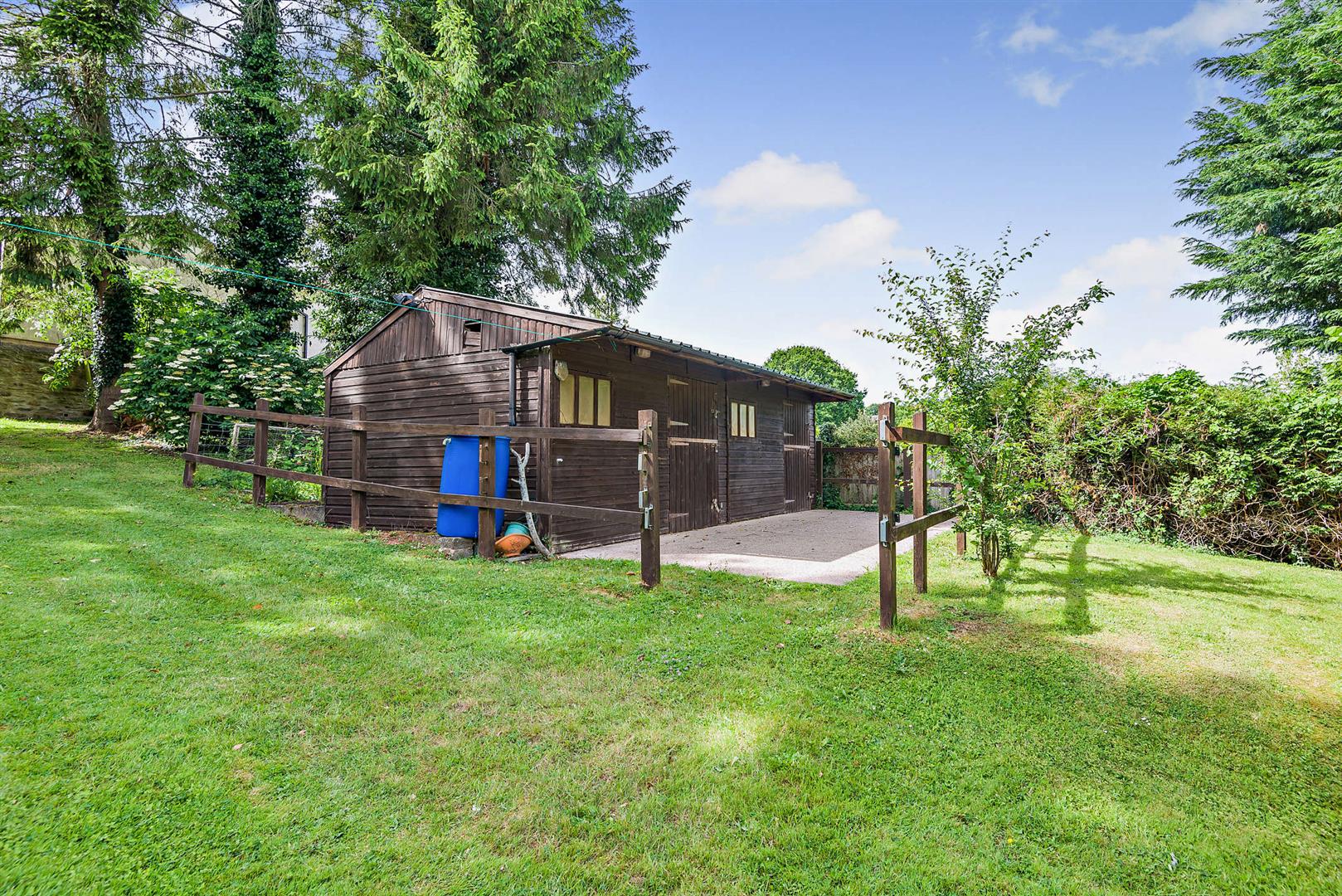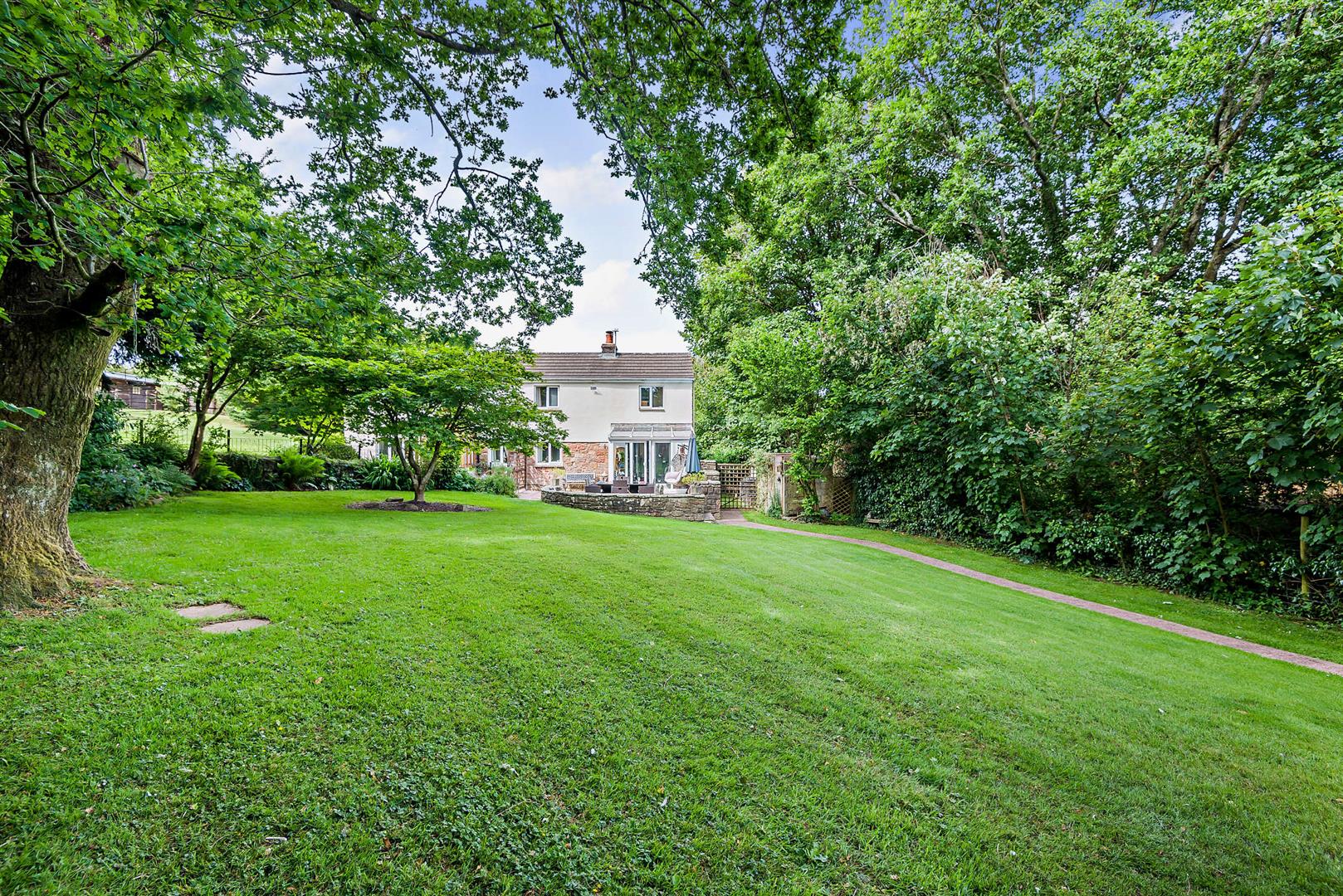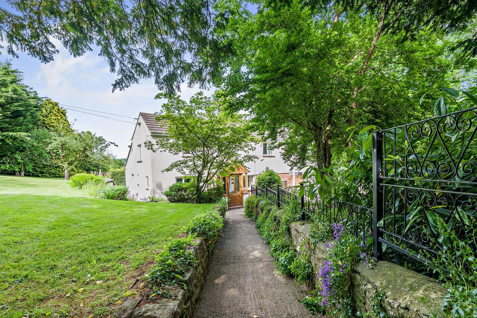 Outside - The property is accessed via a track owned by the Forestry Commission, to which the property has full rights, providing a wealth of parking. The track leads to a detached double garage, from where two pedestrian gates provide entry to the grounds. One of these gates opens to a charming tree-lined walkway bordered by a low stone wall adorned with trailing bellflowers.