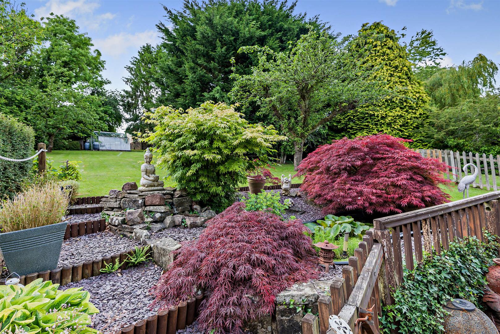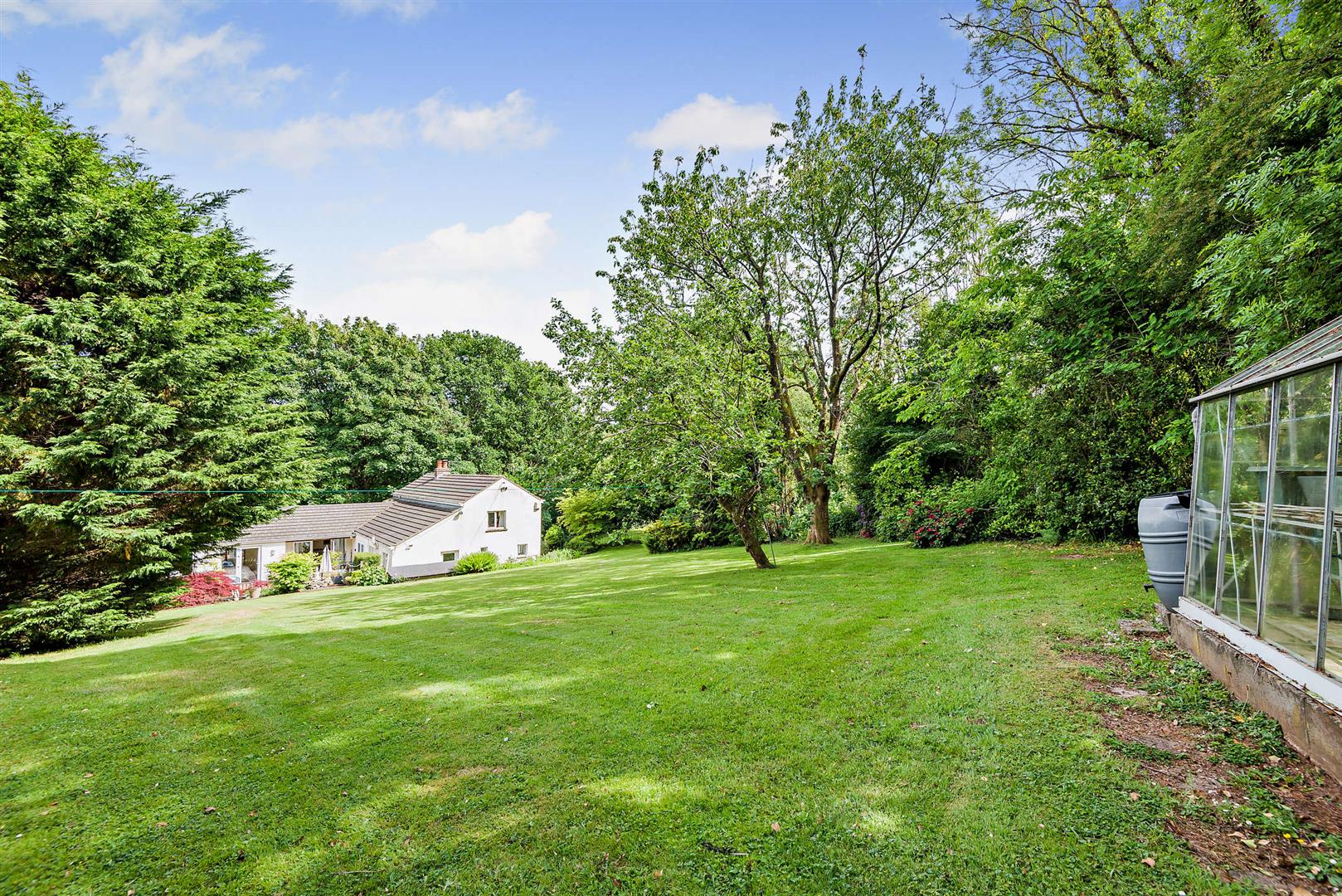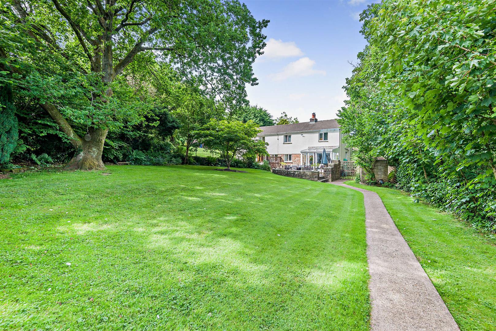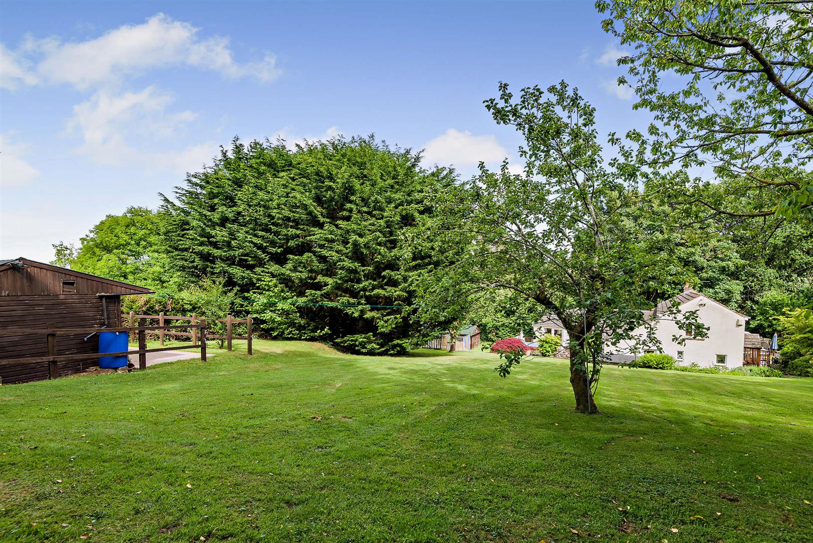 Outside - The property is accessed via a track owned by the Forestry Commission, to which the property has full rights, providing a wealth of parking. The track leads to a detached double garage, from where two pedestrian gates provide entry to the grounds. One of these gates opens to a charming tree-lined walkway bordered by a low stone wall adorned with trailing bellflowers.