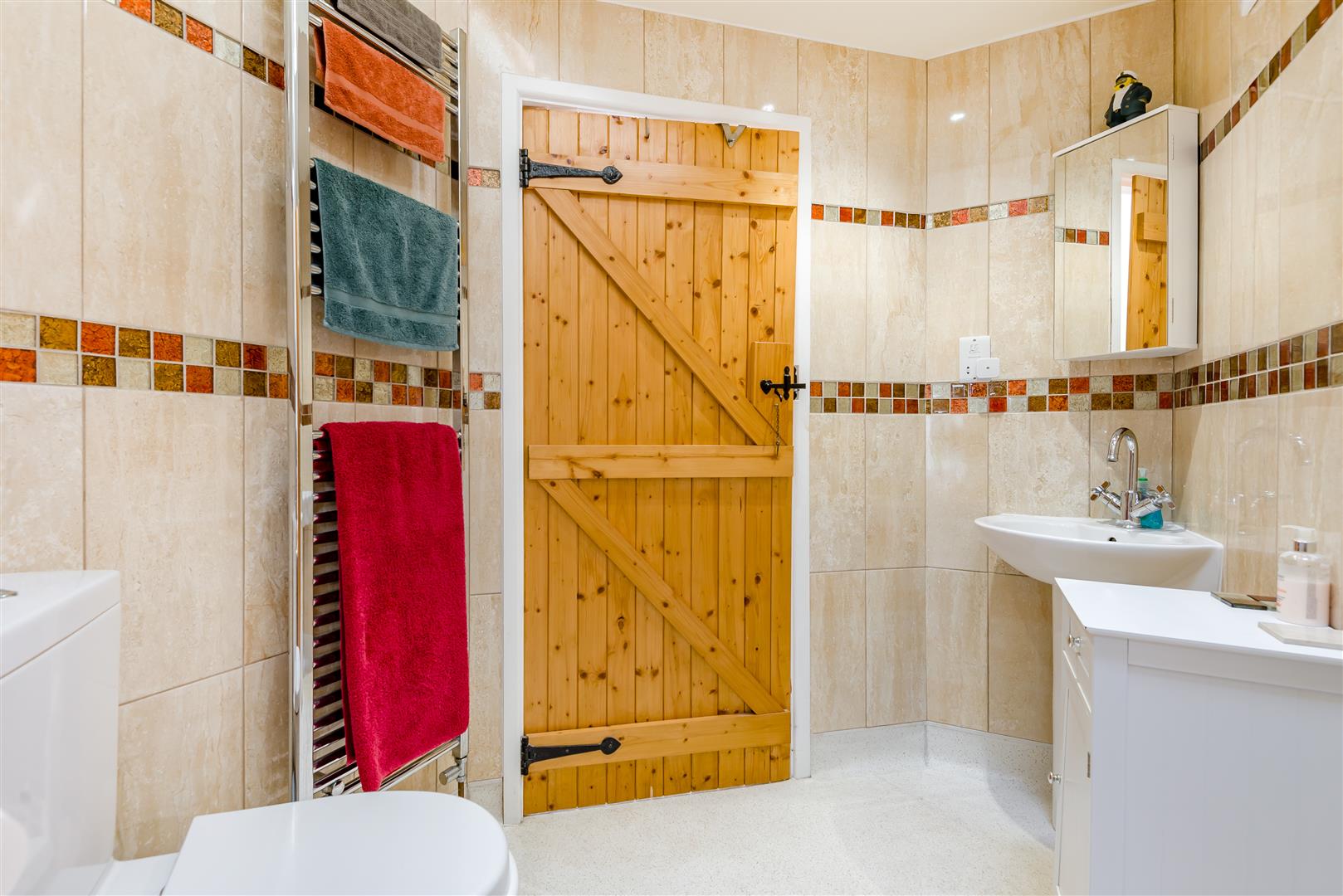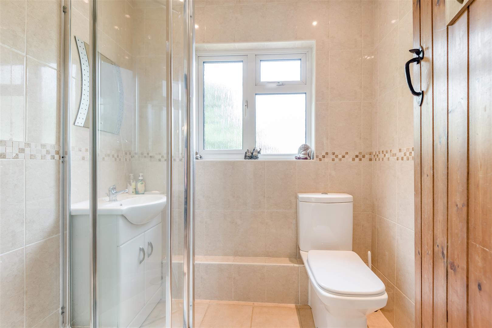 Shower Room - 1.96m x 1.68m (6'05 x 5'06) - Can serve as an en-suite to Bedroom 3. Corner shower enclosure with mains shower over, vanity wash hand basin, low level WC, heated towel rail, tiled walls, tiled flooring, inset ceiling spotlights, rear aspect double glazed upvc window.