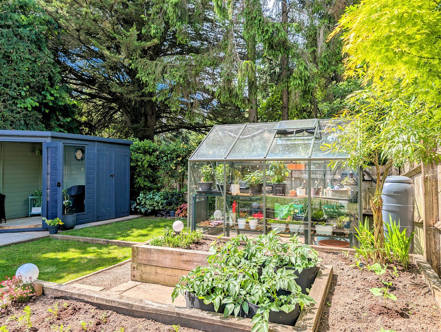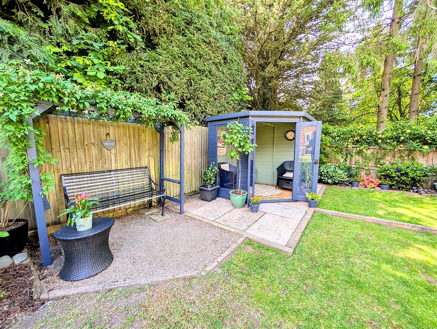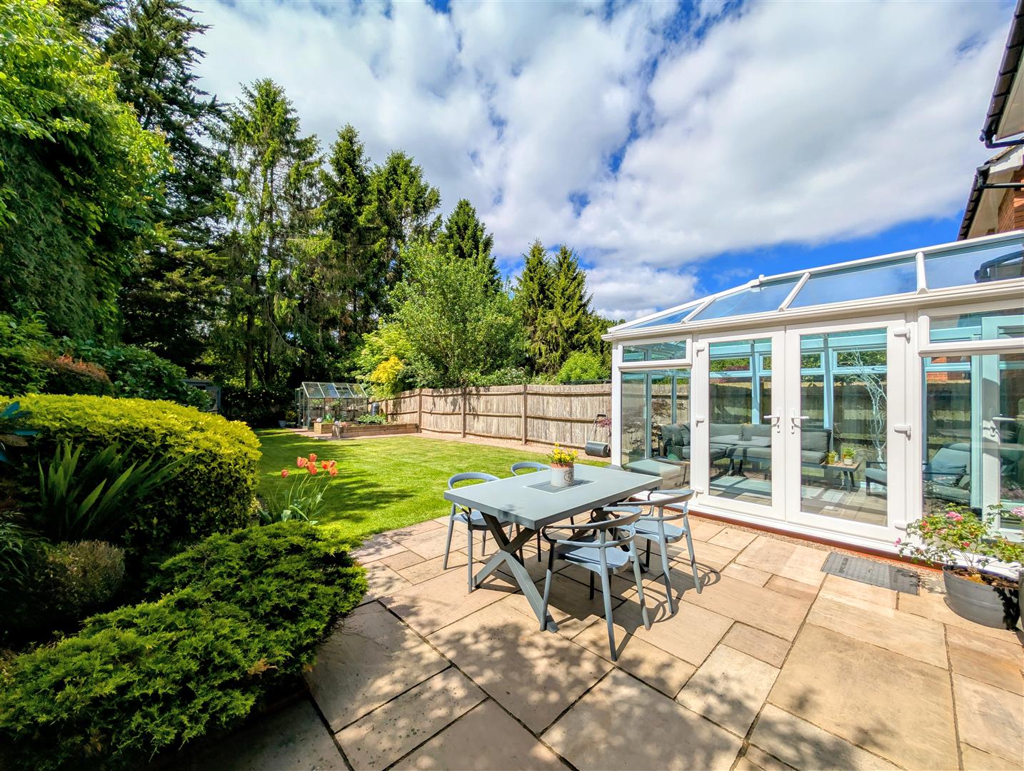 Rear Garden - Paved patio, central lawn, flower borders with various shrubs and bushes, paved and gravel pathway leading to a further paved area, green house, vegetable area with raised beds, summer house, small trees, outside tap and power points, external oil fired central heating and domestic hot water boiler, enclosed by fencing surround and backing onto woodland.