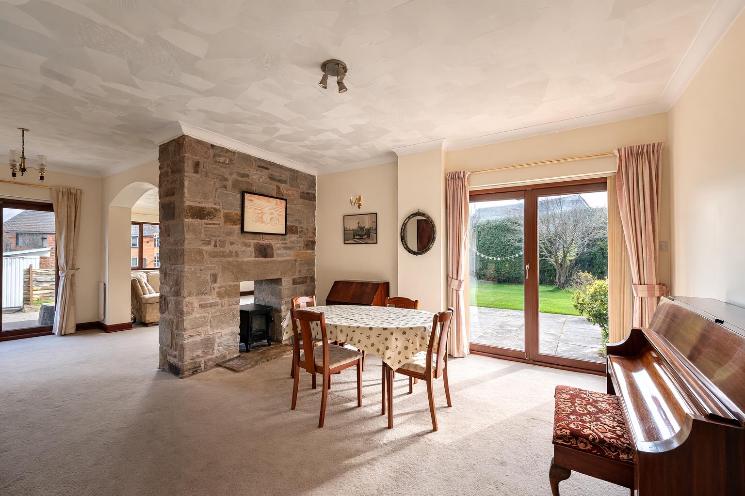 Lounge - 5.72m x 4.93m (18'09 x 16'02) - Spacious dual aspect reception room with radiator. Power points. Television point. Feature fireplace with dual aspect log burning stove. Side aspect double glazed wooden windows. Rear aspect double glazed wooden sliding doors leading out to the garden.