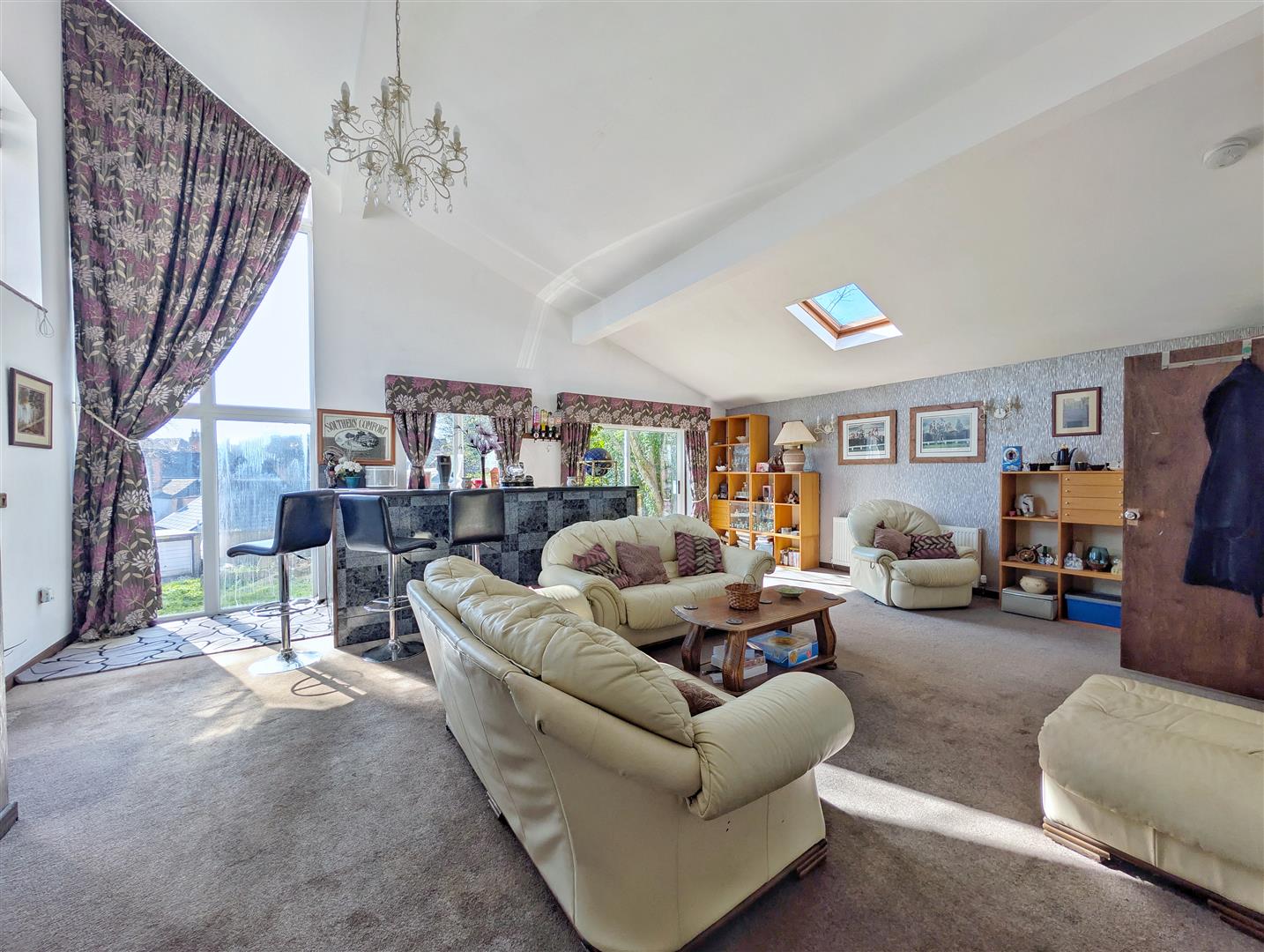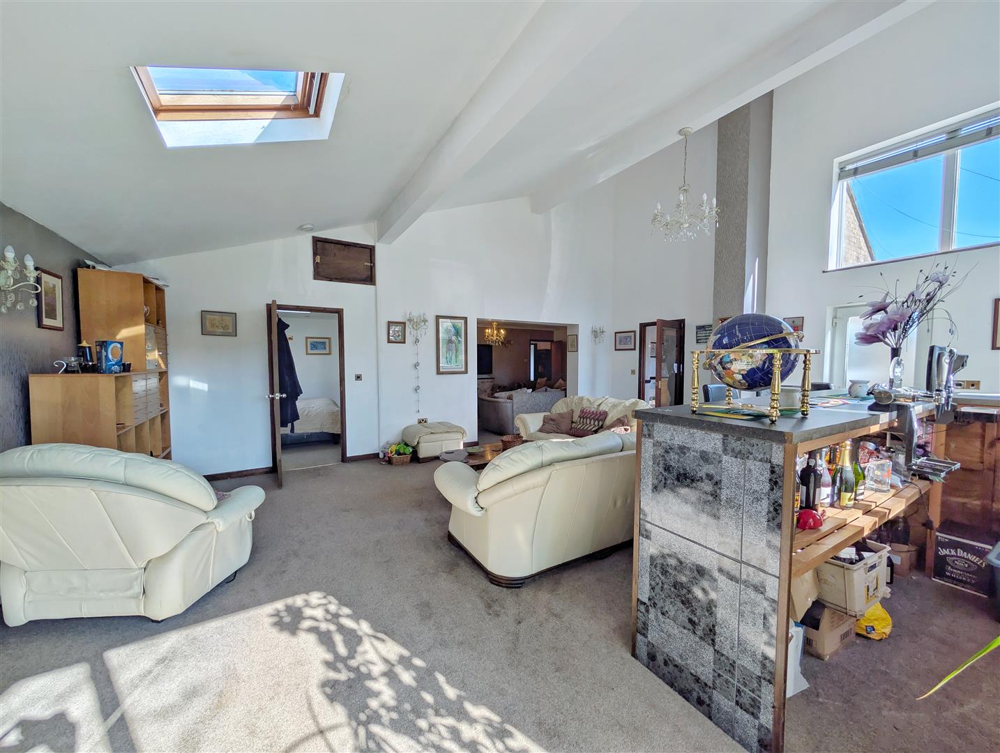 Entrance Hallway/ Open Plan Living Area - 7.21m x 5.59m (23'08 x 18'04) - Accessed via a uPVC double-glazed entrance door, this impressive and spacious open-plan reception area provides a welcoming introduction to the property. A tiled bar area offers an excellent space for entertaining, while the generous layout allows for a variety of freestanding furniture, including sofas and tables, making it a highly versatile living and social space. The room benefits from a floor-to-ceiling uPVC double-glazed window overlooking the front garden, an additional uPVC door providing external access, and a double-glazed Velux windows allowing an abundance of natural light.