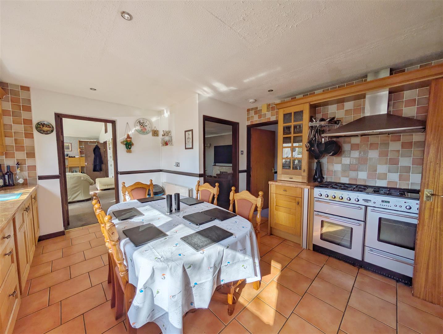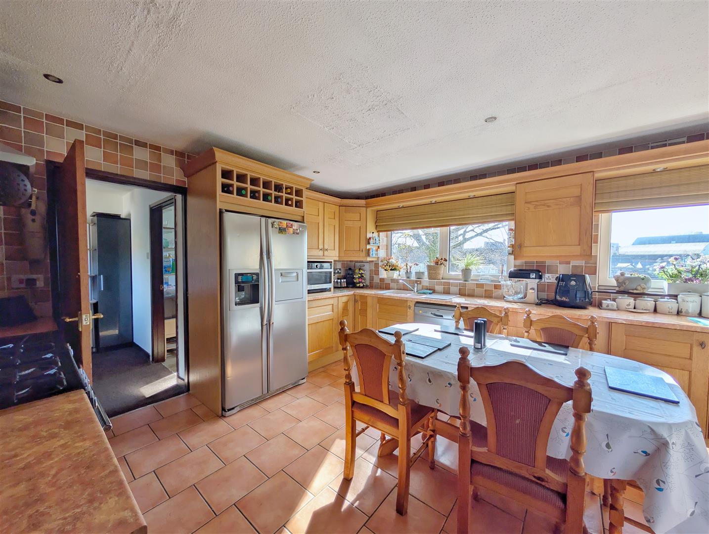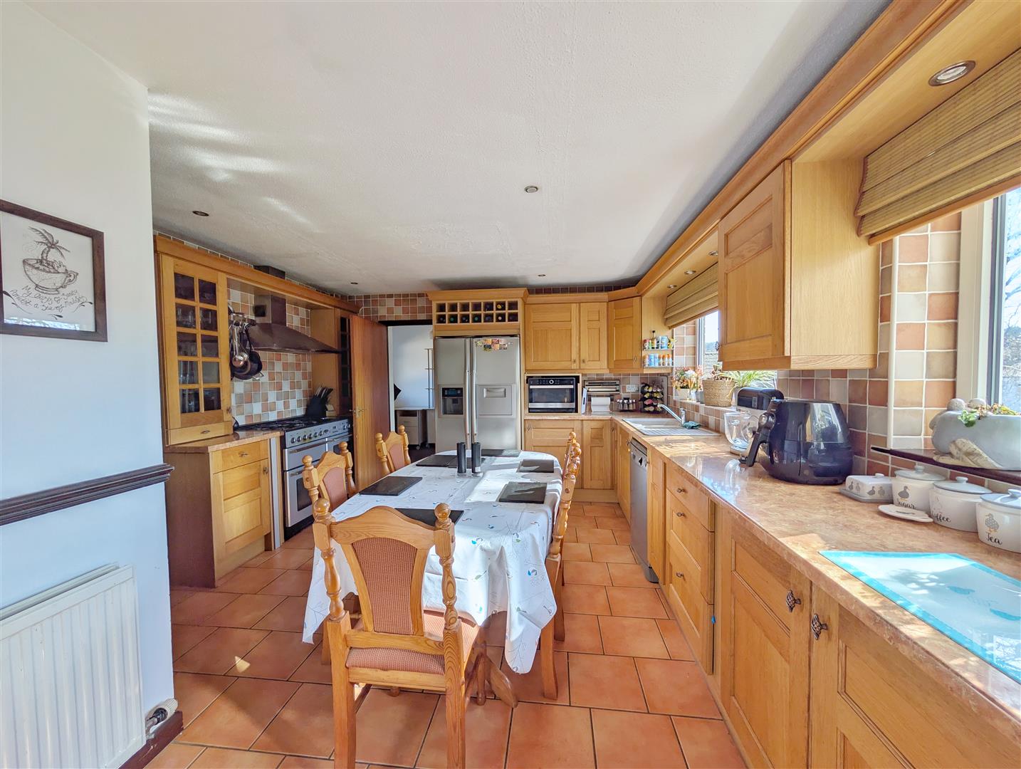 Kitchen - 4.78m x 3.91m (15'08 x 12'10) - A well-equipped kitchen fitted with a range of base and wall-mounted units with roll-top work surfaces. Incorporating a sink and drainer with mixer tap over, the room also benefits from tiled flooring and tiled splashbacks. There is space for a cooker, American-style fridge freezer, and dishwasher, along with power points and a radiator. The layout comfortably accommodates a large dining table, making it ideal for family meals and entertaining. Access through to: