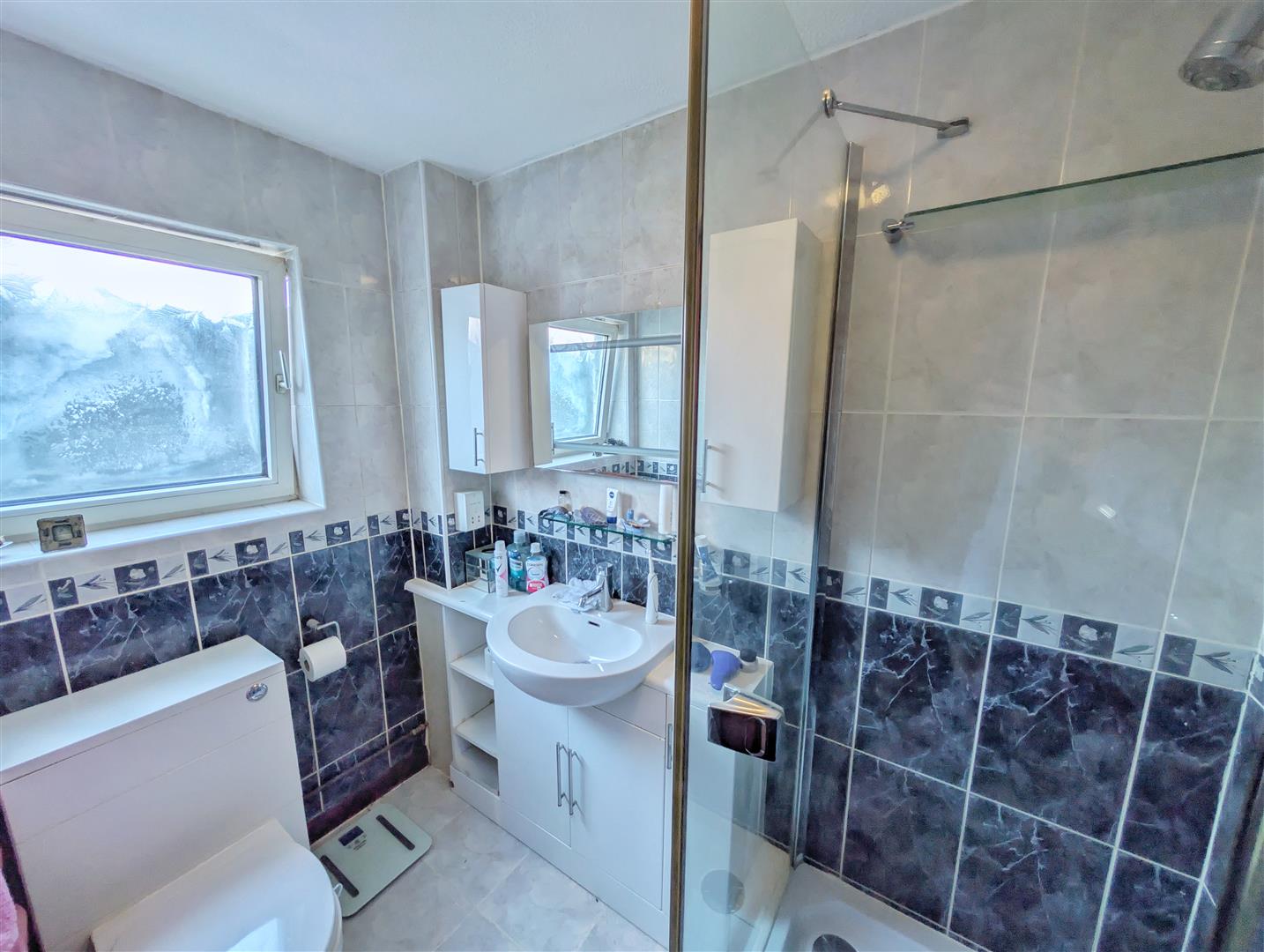 En Suite - 2.13m x 1.63m (7'00 x 5'04) - Comprising a shower cubicle with mains-fed shower, WC, and vanity unit with wash hand basin and storage. Fully tiled walls and flooring, with a frosted uPVC double-glazed window to the side.