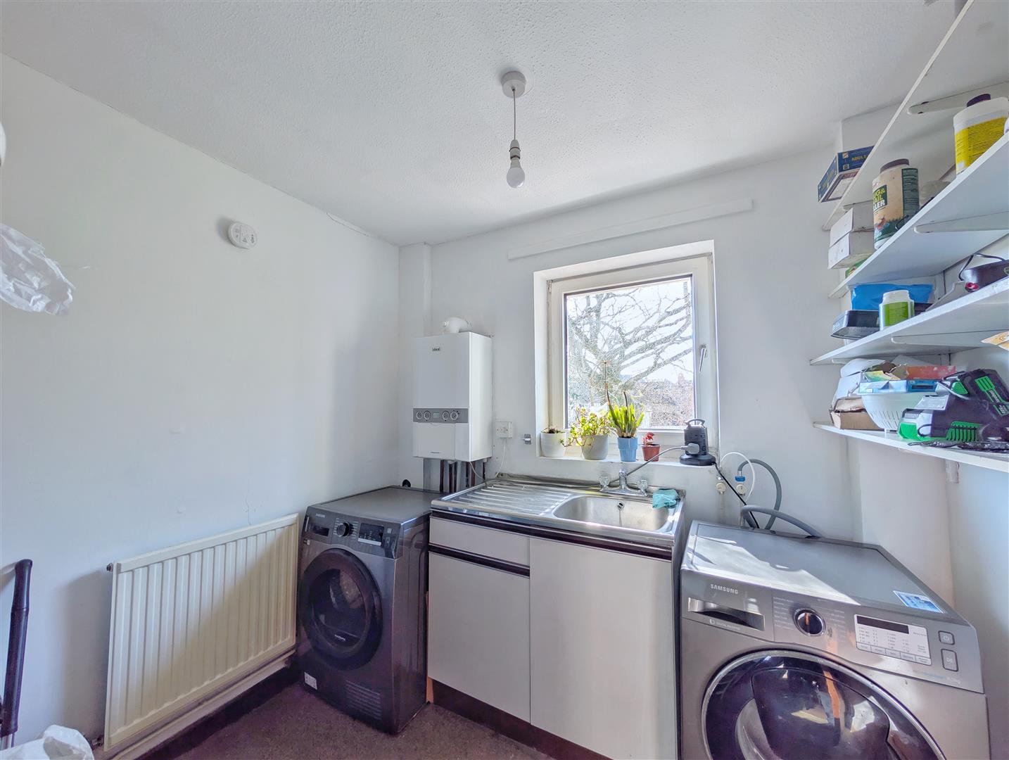Utility Room - Fitted with a sink and drainer with mixer tap, the utility room offers space and plumbing for a washing machine and tumble dryer and houses the wall-mounted boiler. Additional shelving provides ample storage. A uPVC double-glazed window to the front elevation allows for natural light.