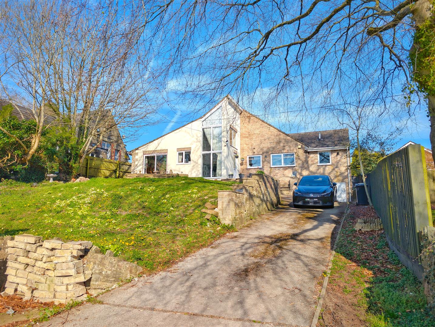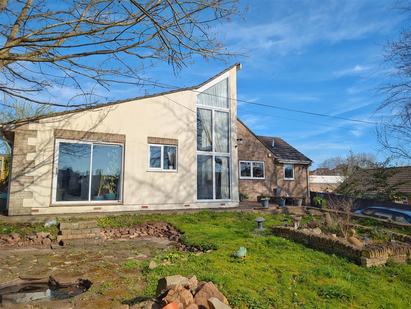 A large driveway provides off-road parking for multiple vehicles. The front garden includes a raised lawn area, paved patio seating space, and a decorative pond. Steps lead up to the main entrance, with side access to the rear garden.