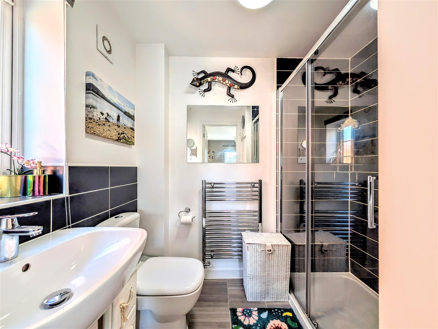 En Suite - Double shower with tiled surrounds and main shower fitted, low level WC, pedestal wash hand basin, tiled flooring, partly tiled walls, heated towel rail, side aspect double glazed upvc window.