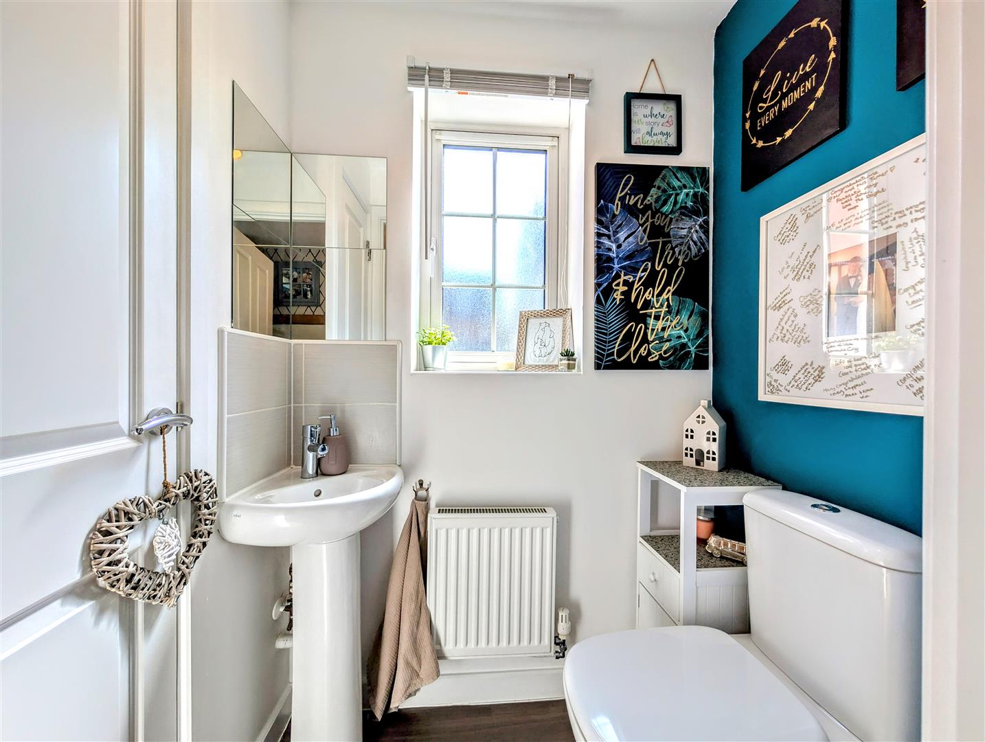 Wc - Low level WC, pedestal wash hand basin with tiled splashbacks, radiator, side aspect upvc double glazed frosted window. Door to storage cupboard.