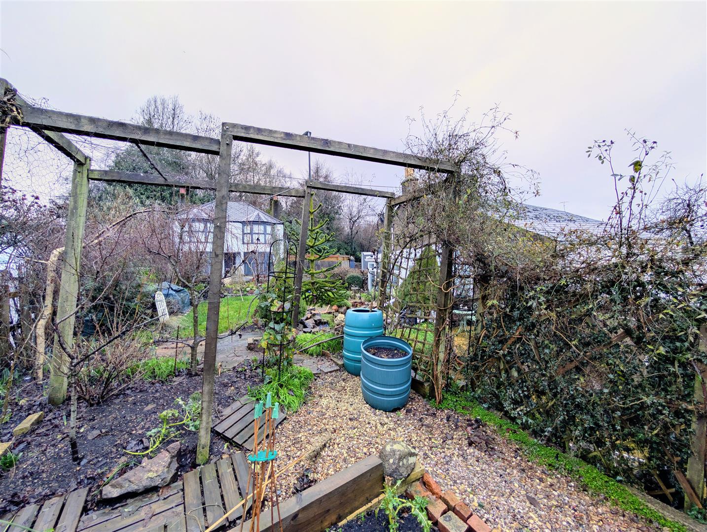 Further sections of the garden include gravelled areas, timber pergola structures, and tucked-away seating spots, offering a variety of spaces to enjoy throughout the day. The garden is enclosed by fencing and hedging, providing a good degree of privacy, with views across neighbouring greenery.