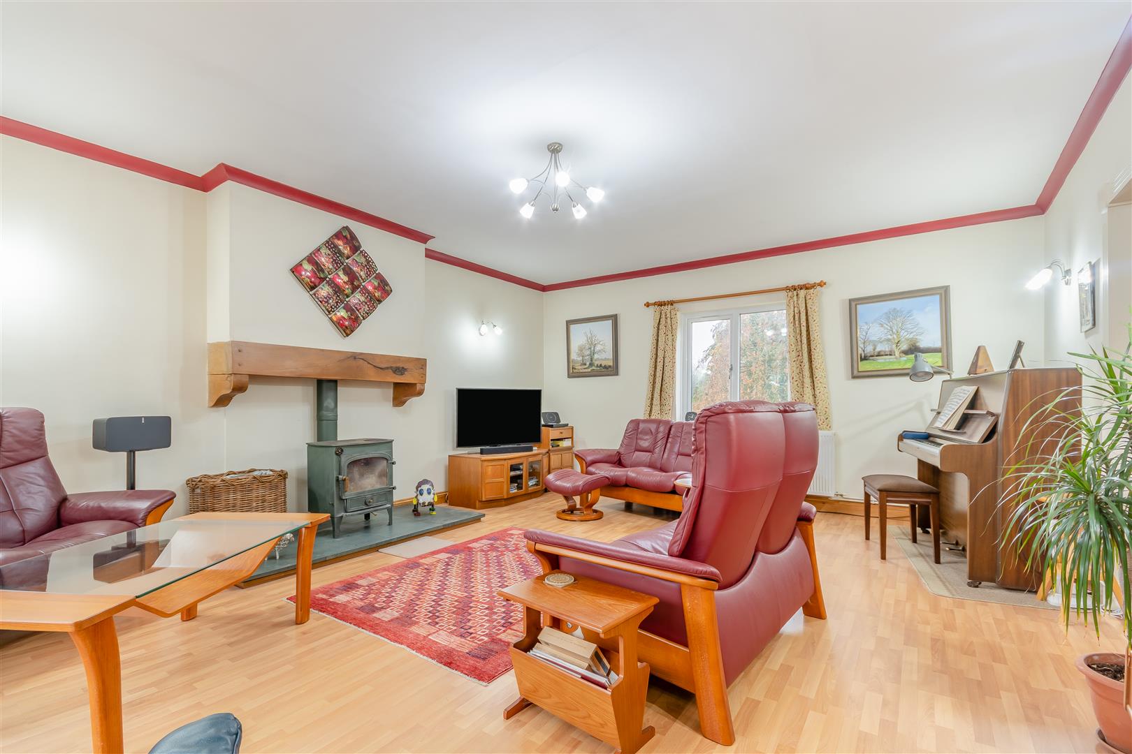 Living Room - 6.58m x 4.83m (21'7 x 15'10) - Wood burning stove, raised hearth, solid timber over, two double radiators, rear aspect window with a lovely outlook over the gardens, fully glazed sliding patio doors to the front patio. Opening through to: