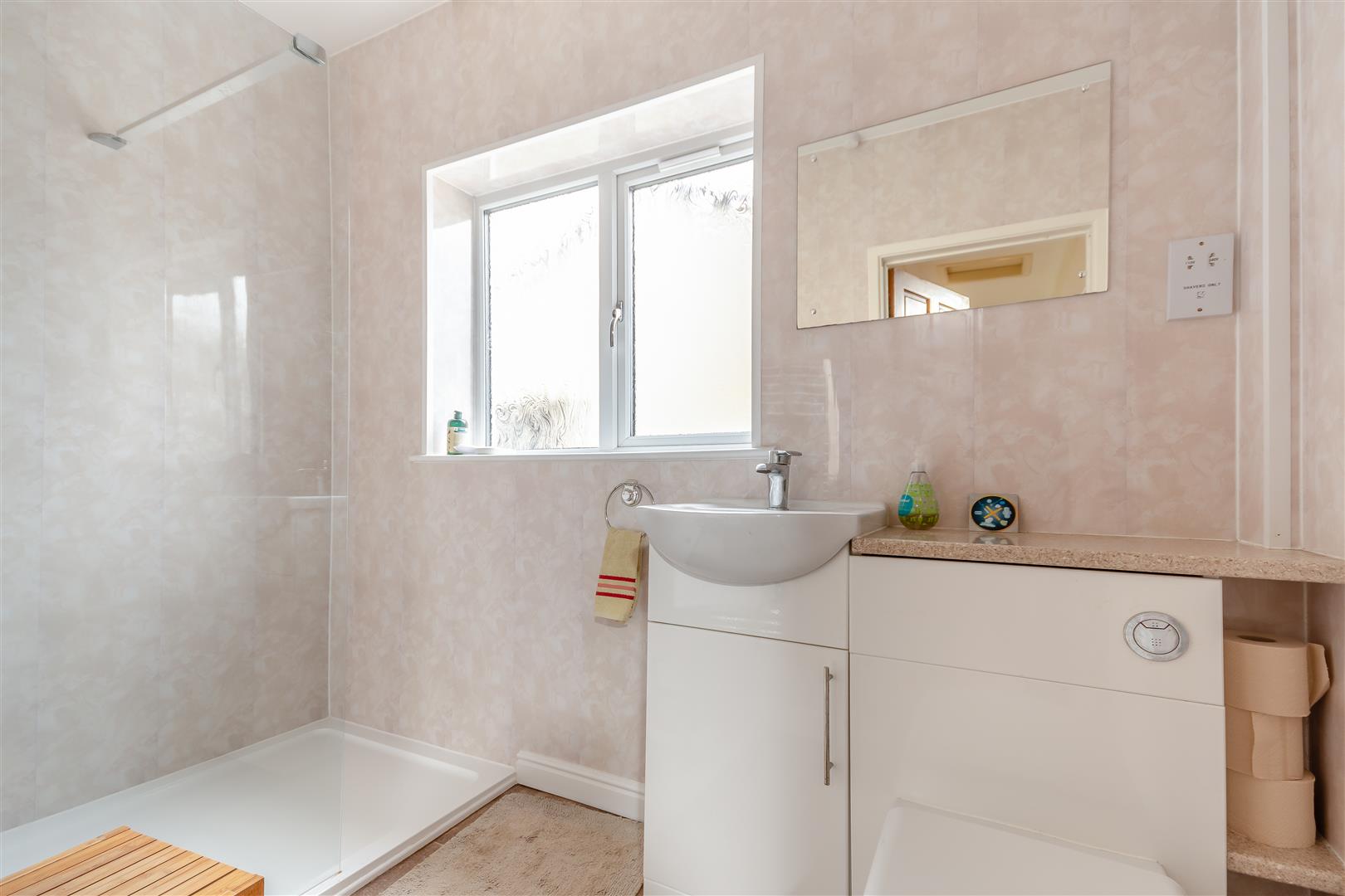 Shower Room - Fitted double walk-in shower, panelled surround, vanity wash hand basin with cupboards below, close coupled WC, heated towel rail, side aspect frosted window.