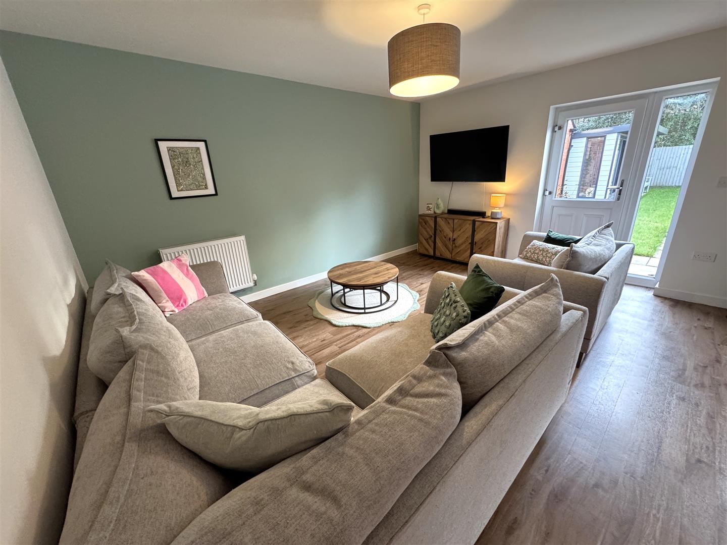 Lounge area with double radiator, thermostat control, TV network points, rear aspect full length window and half glazed door to the gardens.