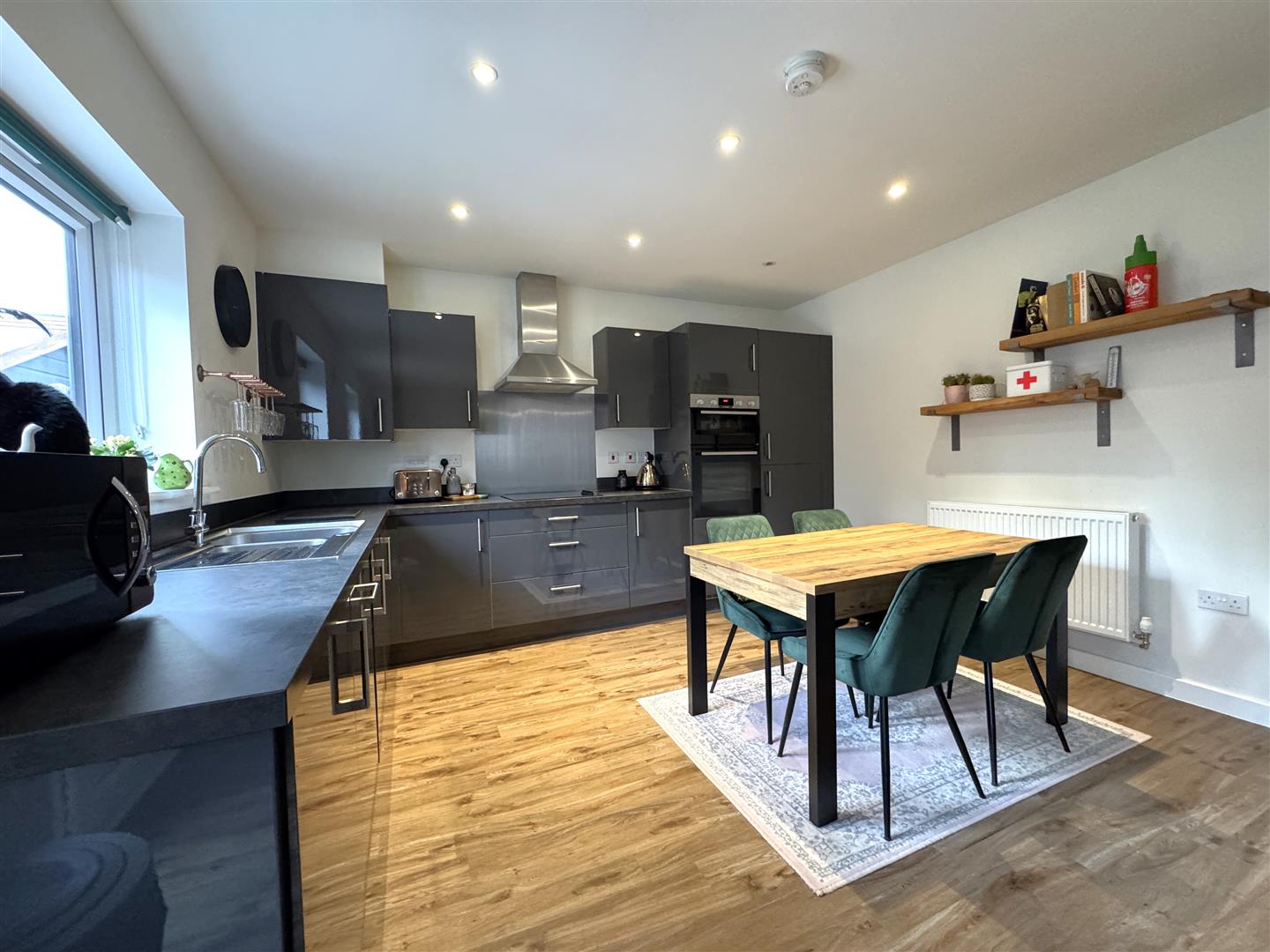 Open Plan Kitchen / Dining / Family Room - 7.19m x 4.62m max narrowing to 3.84m (23'7 x 15'2 - The kitchen comprises of a range of base and wall mounted units with laminated worktops and splashbacks, integrated appliances to include washing machine, dishwasher, Bosch oven with four ring hob and extractor fan, stainless steel splashback, one and a half bowl stainless steel sink with mixer tap, integrated fridge / freezer, double radiator, inset spotlighting, rear aspect window. Opening through to: