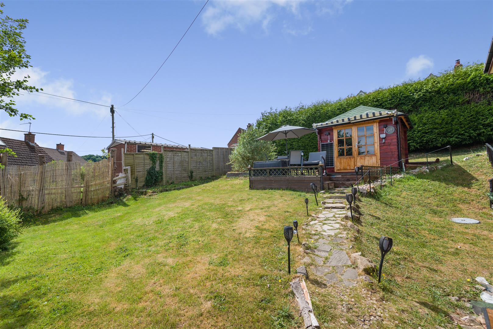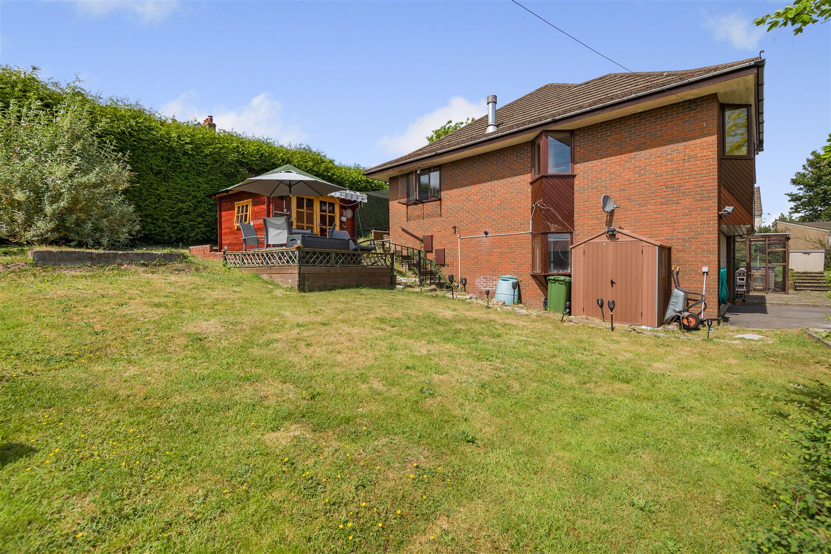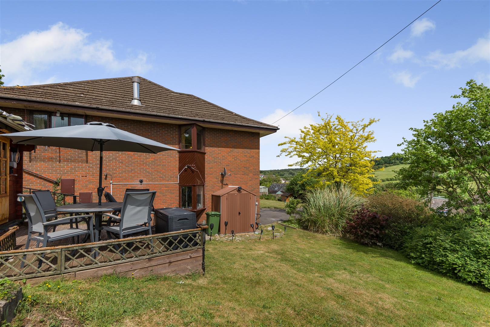 Outside - The gardens surrounding the property are predominantly laid to lawn with shrubs and plants interspersed, along with a shed and useful garden storage.