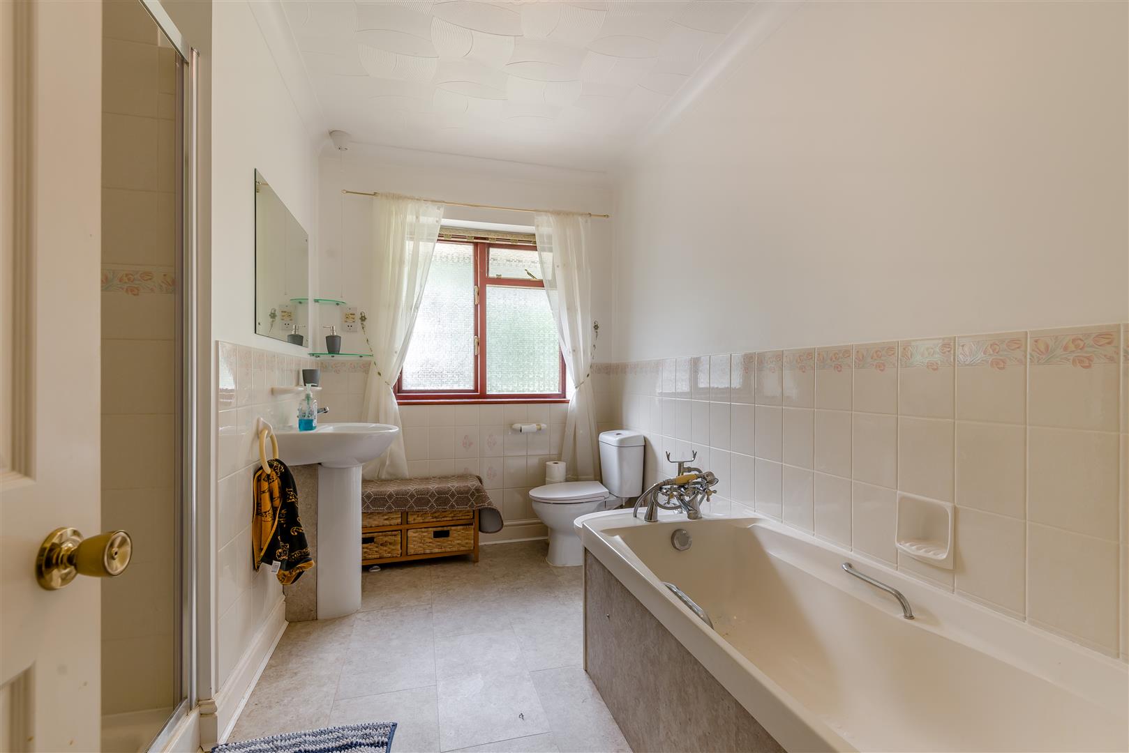 Family Bathroom - White suite comprising a bath with shower attachment, shower cubicle with tiled surround, low level w.c, bidet, pedestal washbasin, radiator, obscured rear aspect window.