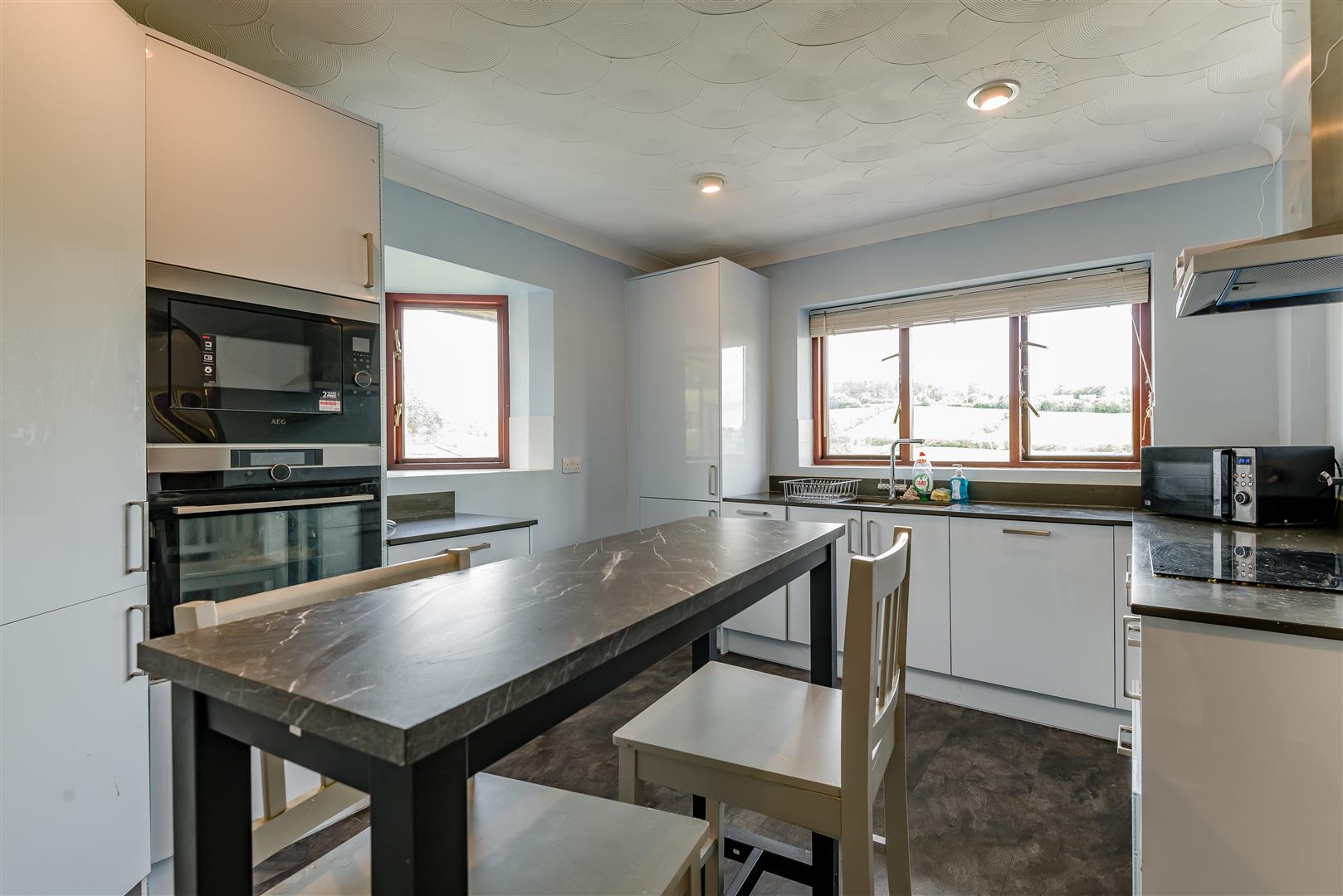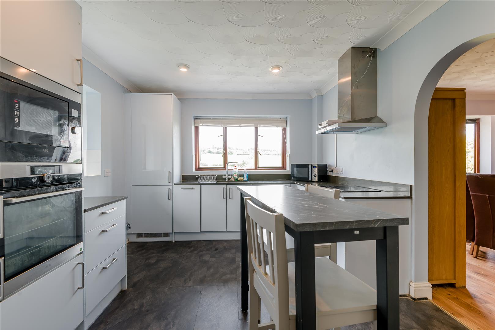 Kitchen - 4.17m x 3.15m (13'8" x 10'4") - Comprising a sleek newly fitted kitchen with a matching range of wall and base level units having laminate worktops and an inset stainless steel sink unit with drainer. Integral electric oven and microwave oven, fridge/freezer and dishwasher. Front aspect window with views, door leads into;