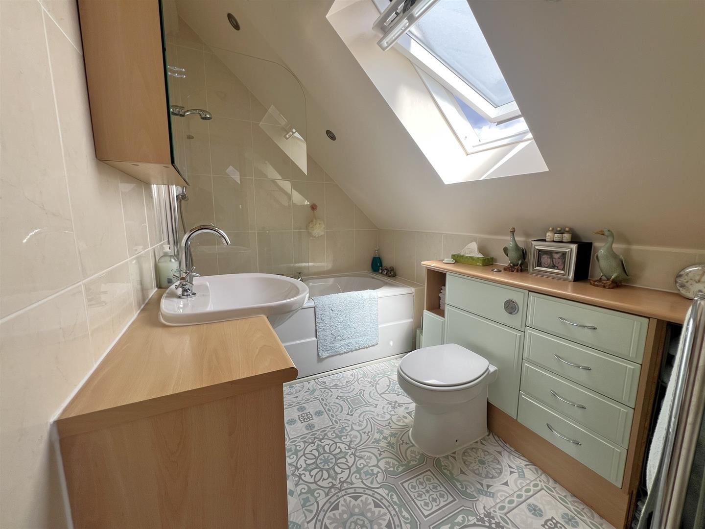 Family Bathroom - 1.98m x 1.47m (6'06 x 4'10) - White suite with close couple w.c, vanity wash hand basin with cupboards beneath, mixer tap over, modern side panel bath with mains fed shower fitted over, ceiling spots, chrome heated towel radiator, fully tiled walls and flooring, front aspect obscure Velux roof light.