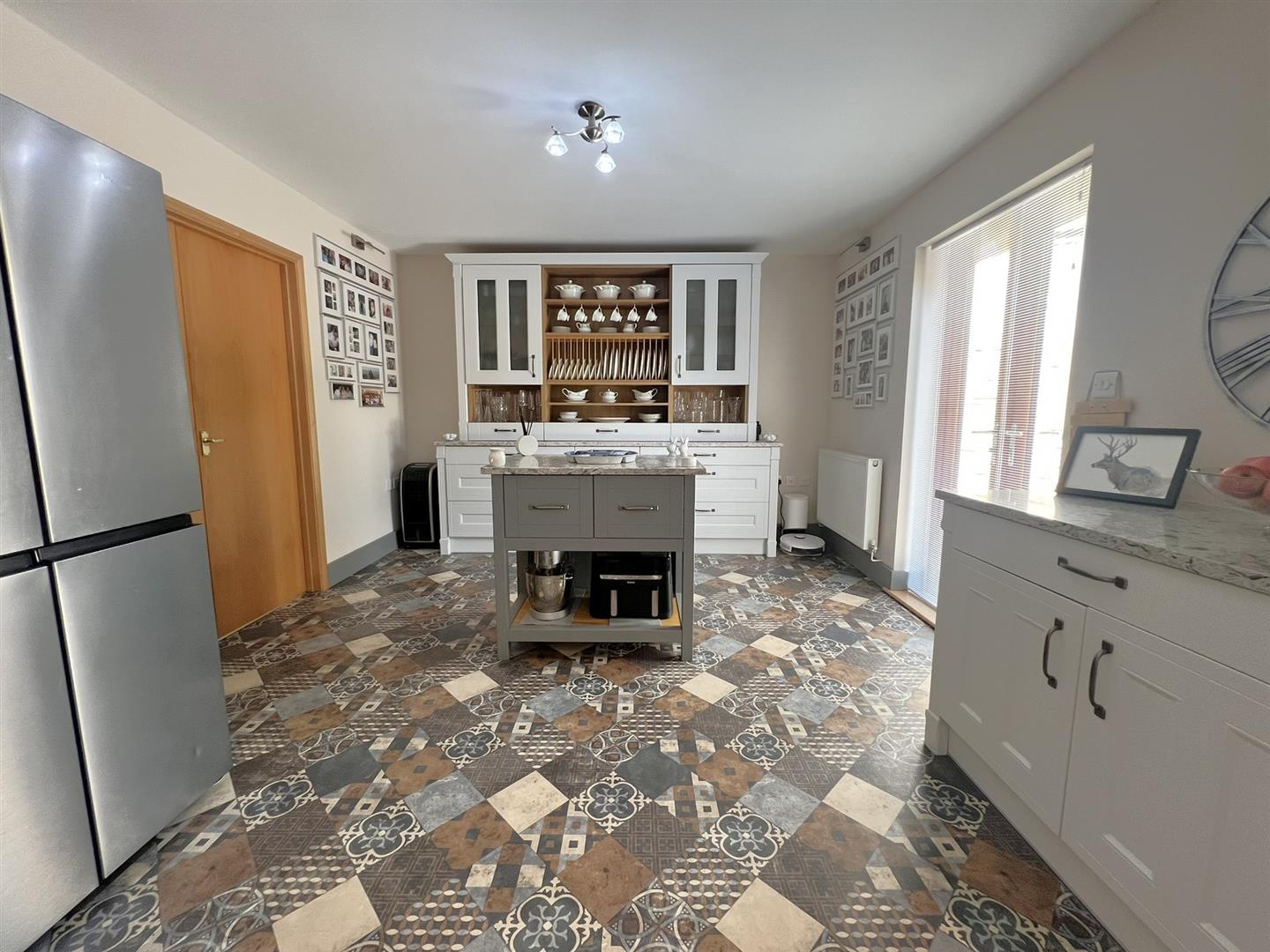 Kitchen Area - 3.96m x 33.78m (13'00 x 110'10) - Ceiling light, wall light points, power points, tv point, telephone point, double radiator, continuation of the vinyl flooring, range of base and wall mounted units including dresser storge, quartz worktops, space for American fridge/freezer, pair of woodgrain upvc double glazed French doors opening onto the rear garden.